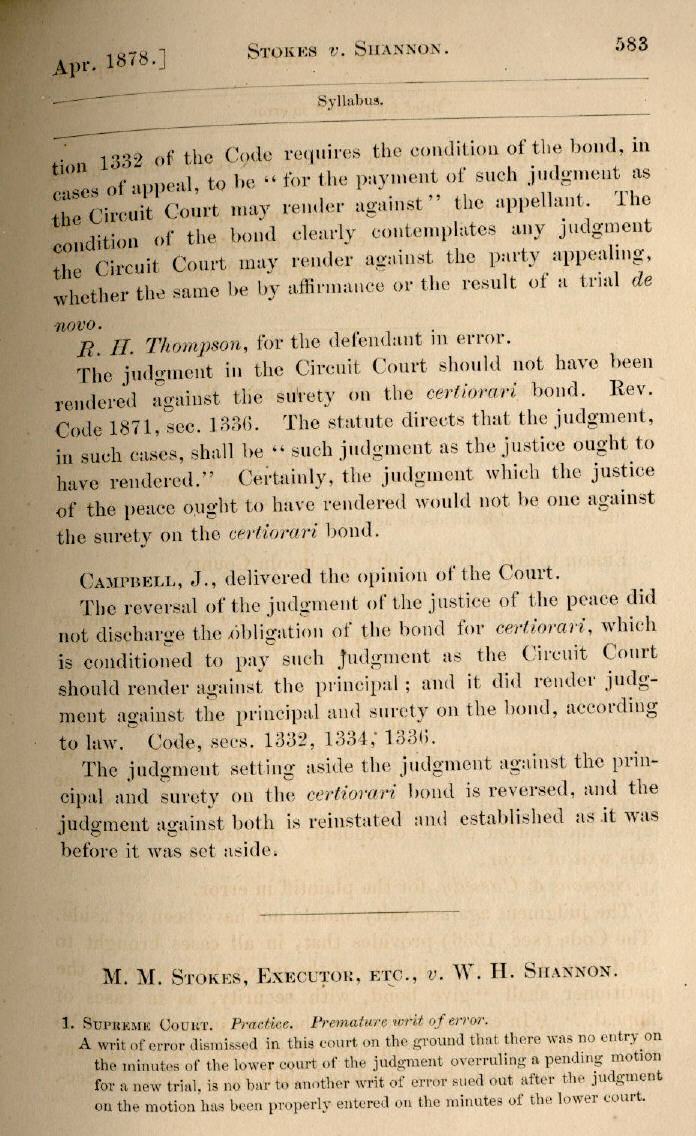 | M. M. Stokes, Executor, etc., v. W. H. Shannon 583, 584, 585, 586 |