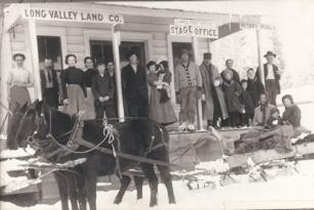 The first three people, from the left are; Hattie & William Bartlett Boydstun, and Cynthia (possibly Sparlin'), then, the seventh person (tall man) is Lige, the woman by him holding the child is my Grandmother, Florida Boydstun. We don't know any of the other persons, perhaps someone will recognize them. William B. Boydstun was the proprietor of the store, it served as the Land Co. office, Post Office, Stage Office, and William was also the town Notary. All of this is noted along the eve of the building as you can see.