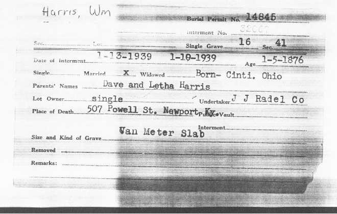| h6200004.jpg | Evergreen Cemetery -- William HARRIS cemetery card, 1939 | 03/04/03 | Kerry Kirk |