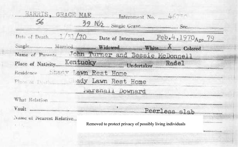 | h6200005.jpg | Evergreen Cemetery -- Grace HARRIS cemetery card, 1970 | 03/04/03 | Kerry Kirk |