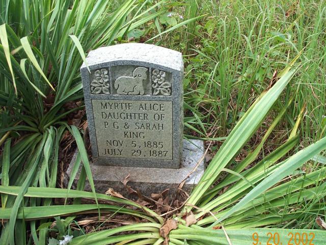 | King | Myrtie Alice | 5 Nov 1885 | 29 Jul 1887 | d/o Porter G. & Sarah King; "MAK" on marker at the foot of the grave. | myrtieking.jpg |