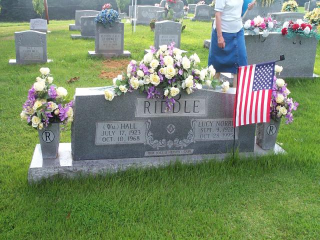 | Riddle | William Hall | 17 Jul 1923 | 19 Oct 1968 | ossw Lucy Norris; "Our loss is Heaven's gain"; PVT US Army World War II; Parents of Rebecca, Joan, Roger, Grandparents of Jason, Rebecca, Angela, Great grandparent of Micah, William, Dawson, Samuel, Matthew, Jane | 16, 17, 19 |