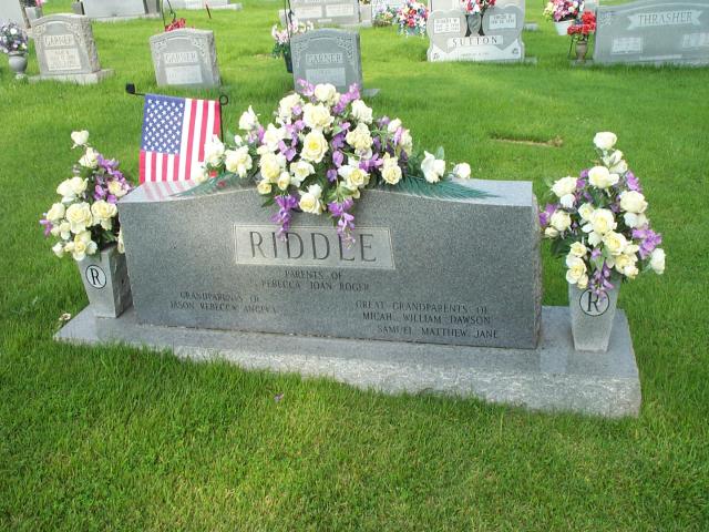 | Riddle | Lucy Norri | 9 Sep 1922 | 28 Oct 1995 | ossw Wm. Hall; "Our loss is Heaven's gain"; Parents of Rebecca, Joan, Roger, grandparents of Jason, Rebecca, Angela, Great grandparents of Micah, William, Dawson, Samuel, Matthew, Jane | 16, 19 |
