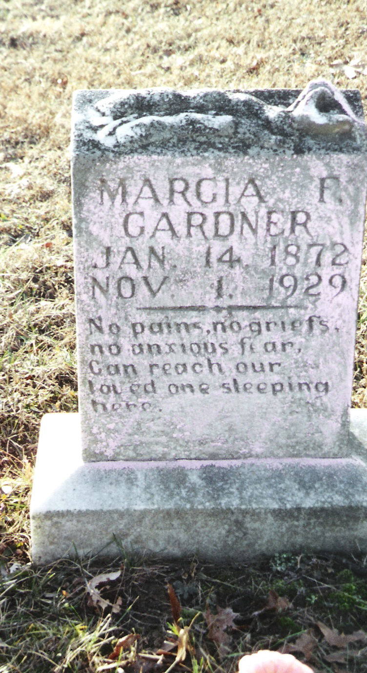 | Gardner | Marcia F. | 14 Jan 1872 | 1 Nov 1929 | "No pains,k no griefs, no anxious fear can reach onr lovved one sleeping here." | 13 |
