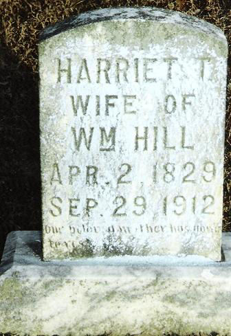 | Hill | Harriett T. | 2 Apr 1829 | 29 Sep 1912 | w/o Wm; "Our beloved daughter has gone home to Jesus" | 23 |