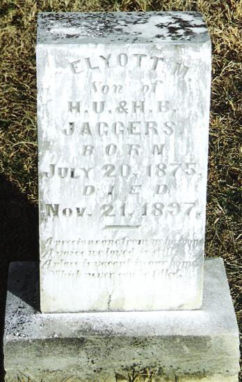 | Jaggers | Elyott M. | 20 Jul 1875 | 21 Nov 1897 | s/o HU & HB; "A precious one from us has gone. A voice we loved is still. A place is vacant in our home which never can be filled." | 27 |