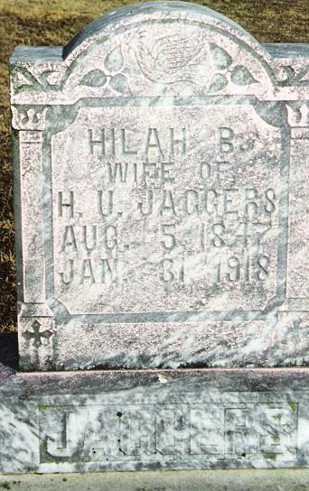 | Jaggers | Hilah B. | 5 Aug 1847 | 31 Jan 1918 | w/o Hardy U. | 30 |