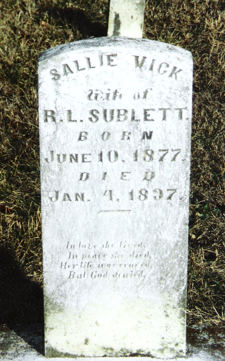 | Sublett | Sallie Vick | 10 Jun 1877 | 4 Jan 1897 | w/o R.L.; "In love, she lived, In peace she died. Her life was erased, but God denied." | 41 |