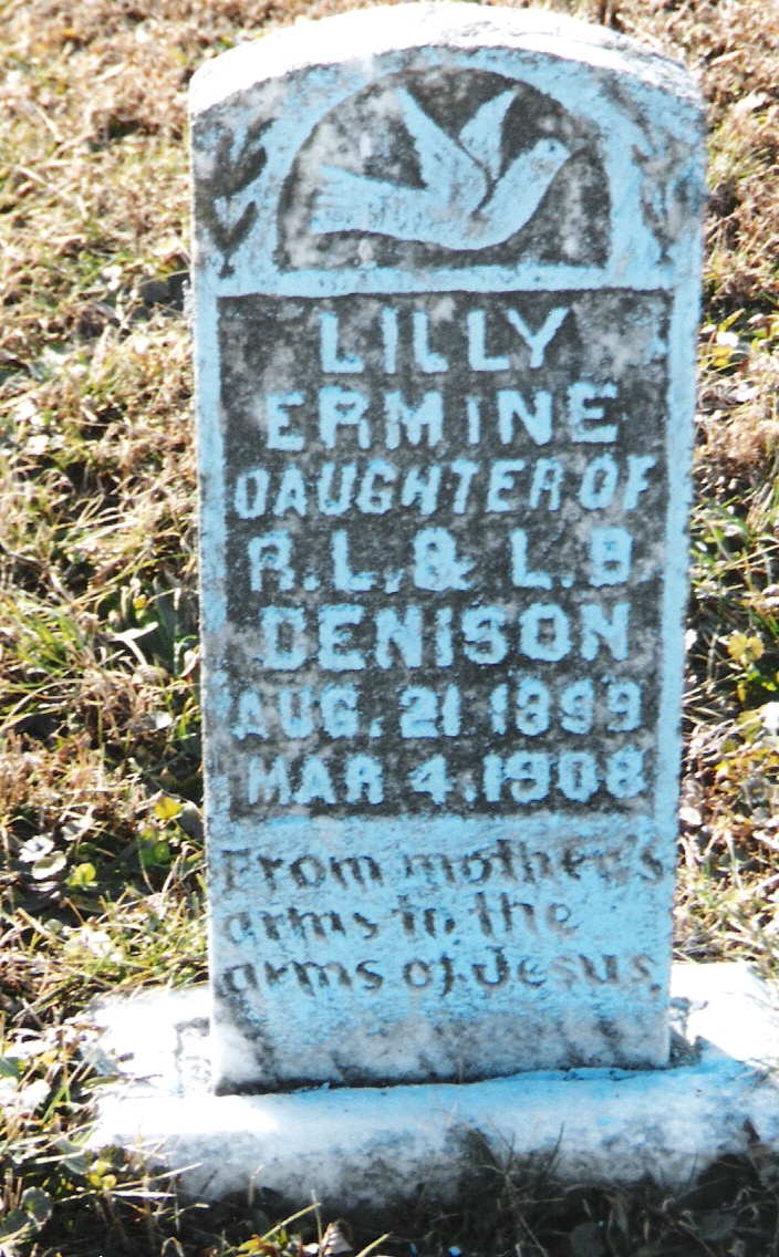 | Denison | Lilly Ermine | 21 Aug 1899 | 4 Mar 1908 | d/o R.L. & L.B.; "From Mother's arms to the arms of Jesus" | 7 |