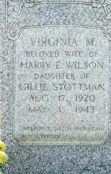 "Beloved w/o Harry E. Wilson"; d/o Gillie Stottman; "Weep not, she is not dead but sleepeth"