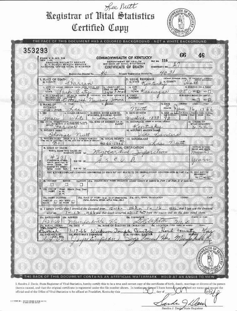 Nutt, Lee, 1966, Death Certificate |