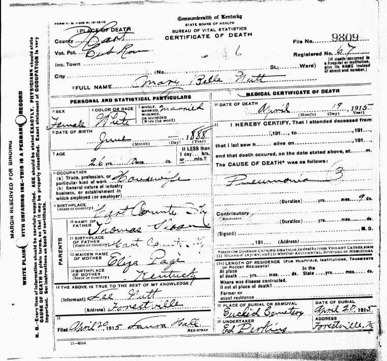 Nutt, Mary Belle, 1915, Death Certificate |
