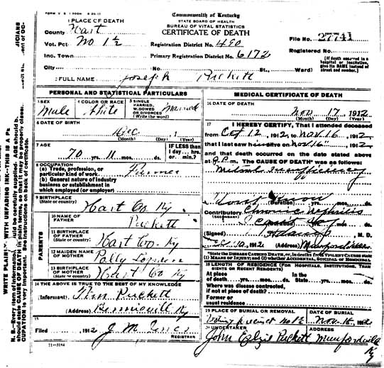 Puckett, Joseph, 1912, Death Certficate |