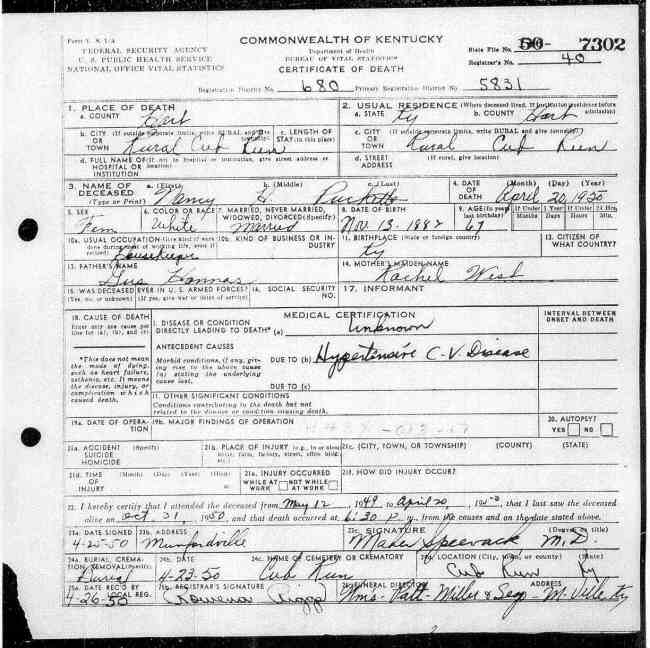 Puckett, Nancy Harris, 1950. Death Certificate |