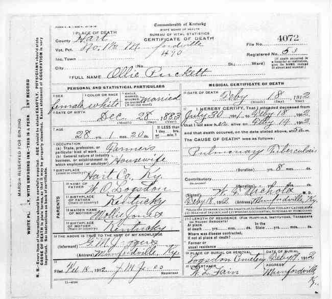 Puckett, Ollie, 1912. Death Certificate |