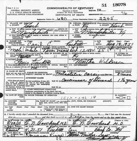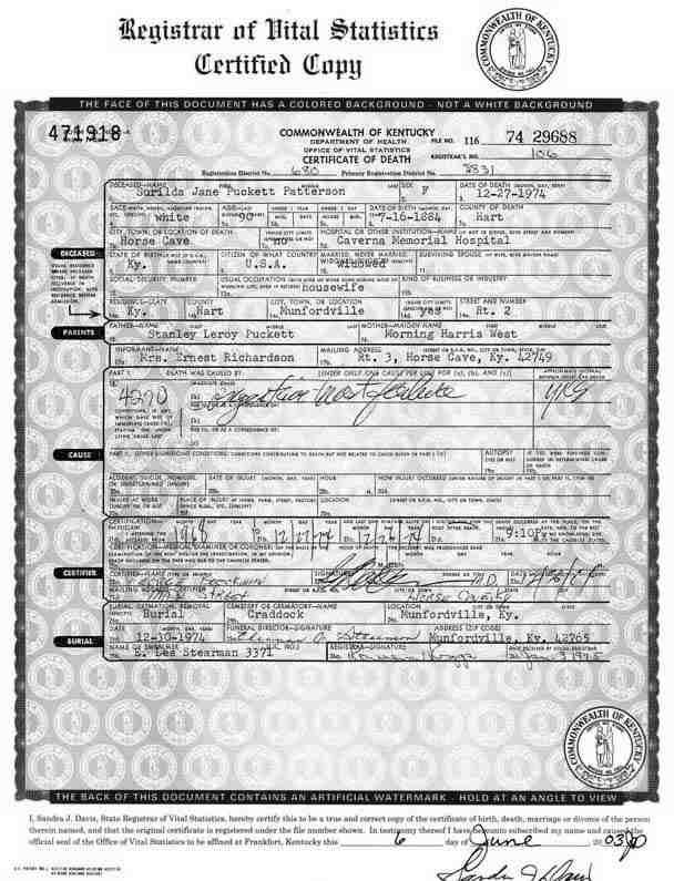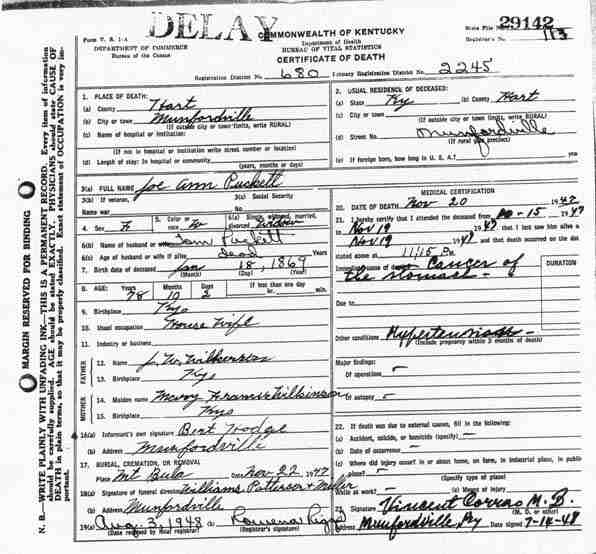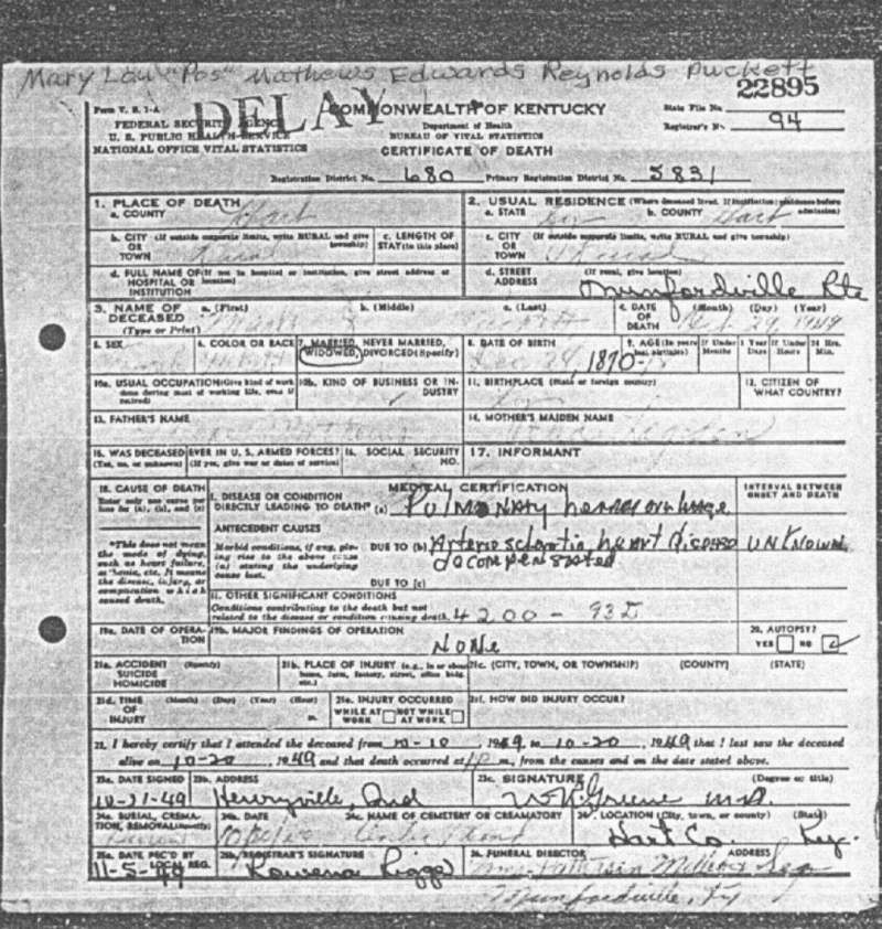 Puckett, Mary Lou Puckett, 1949, Death Certificate |