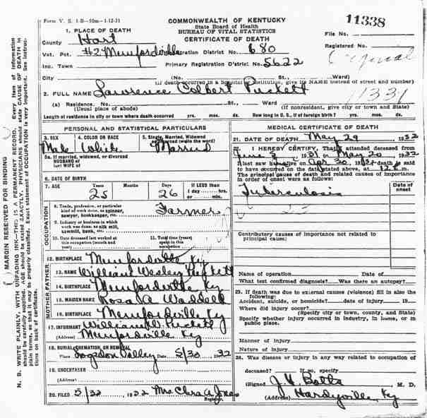 Puckett, Lawrence Colbert, 1932, Death Certificate |