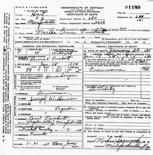 Puckett, Martha Ann, 1935, Death Certficate |