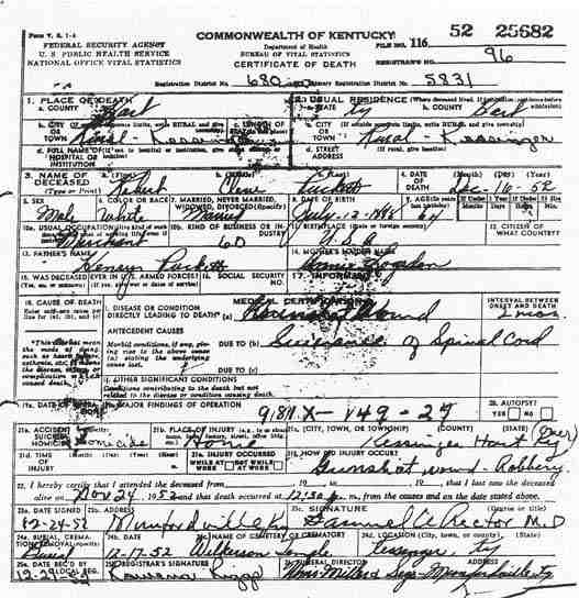 Puckett, Robert Cleve, 1952, Death Certficate |