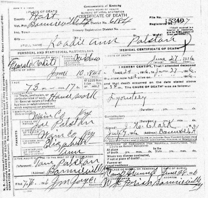 Puckett, Mary Frances (Malinda), 1916, Death Certficate |