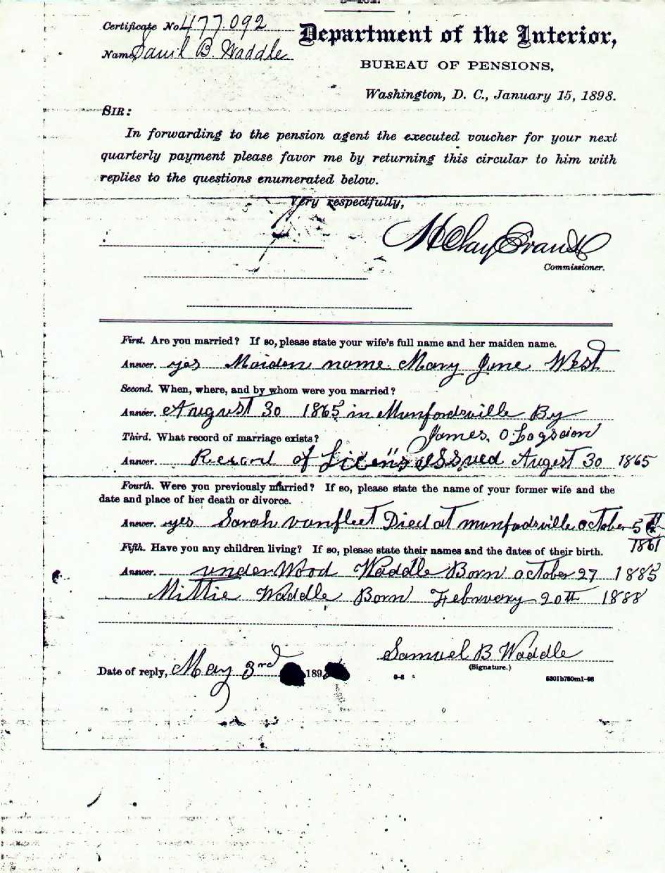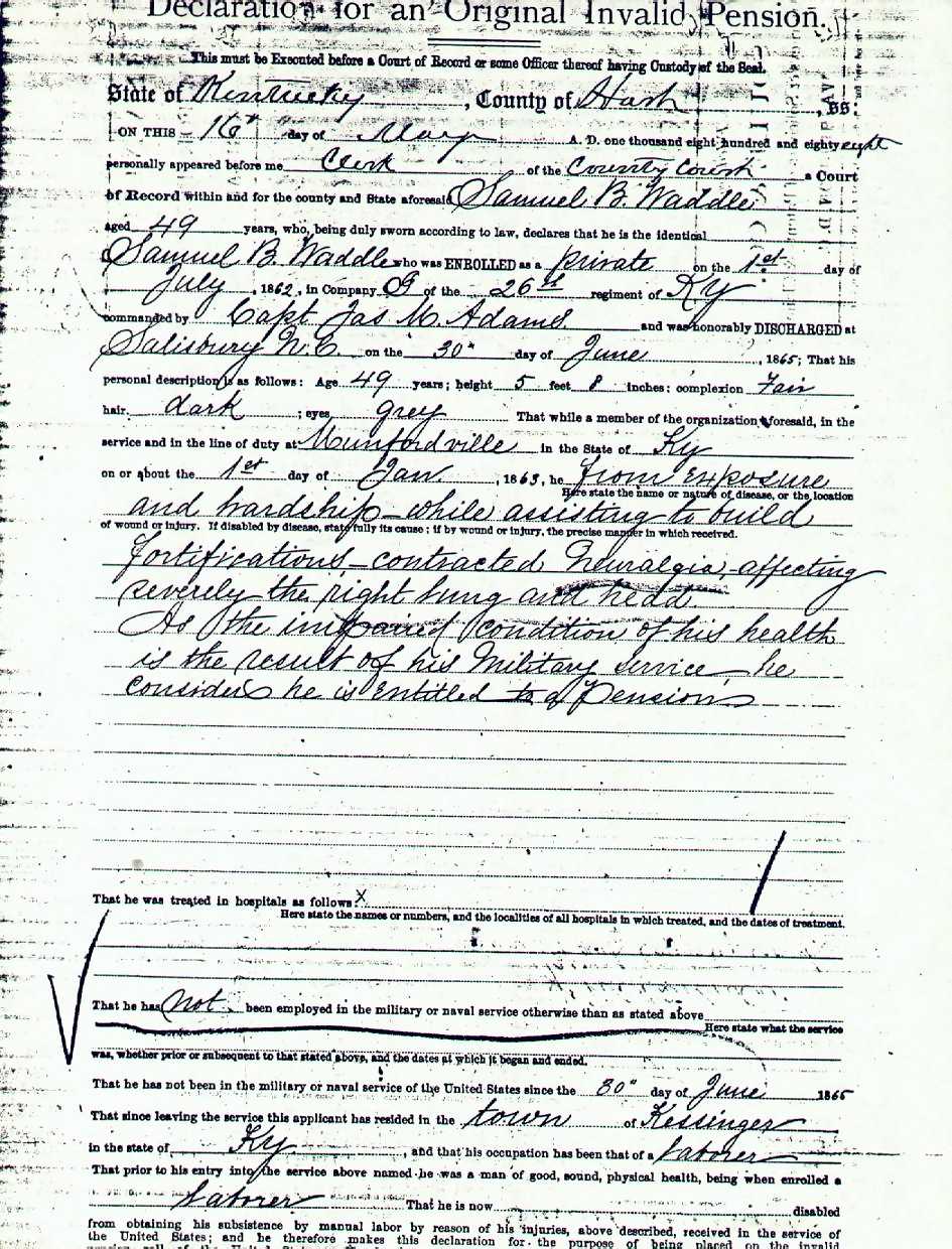 Waddle, Samuel B., Civil War Pension Application, p. 1 |