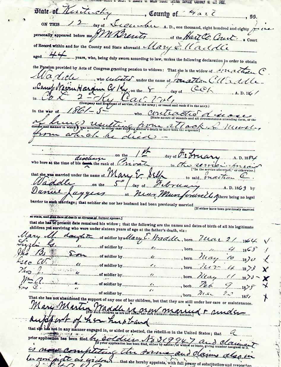 Waddle, Jonathan Clayborn, Civil War Pension Application, p. 1 |