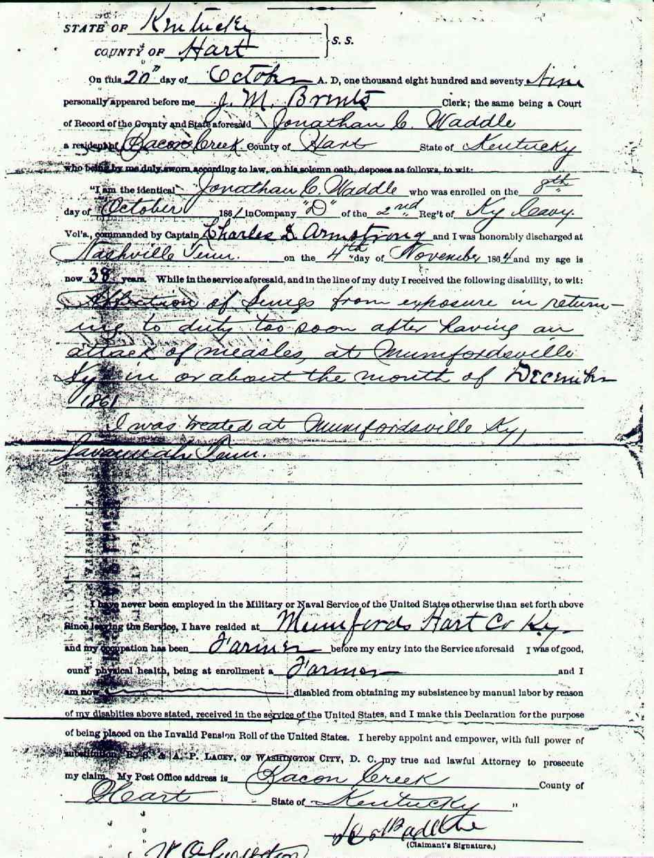 Waddle, Jonathan Clayborn, Civil War Pension Application, p. 3 |