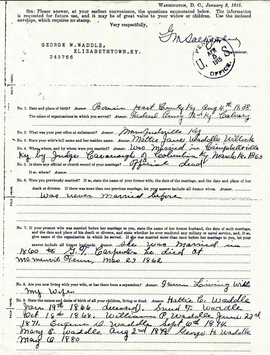 Waddle, George W., Civil War Pension Application, p. 1 |