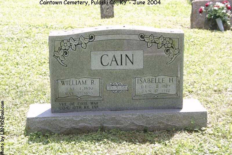 | William R. | 4 Jun 1830 | 17 May 1895 | "Married 5 Oct 1858; ossw Isabelle; Vet of Civil War, Co. C, 12th KY INF"; Photo | LBNY2@aol.com | |