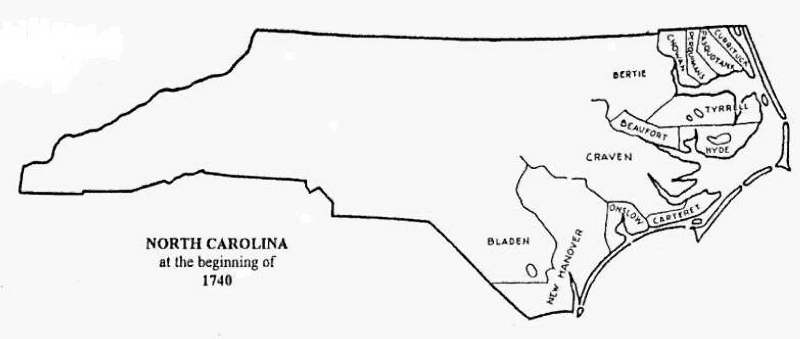 1740 - North Carolina County Formation Size: 21Kb Drawn by: David Leroy Corbitt Source: reproduced from The Formation of the North Carolina Counties, 1663-1943 by David Leroy Corbitt, published and copyrighted by the Division of Archives and History, North Carolina Department of Cultural Resources, Raleigh, NC.