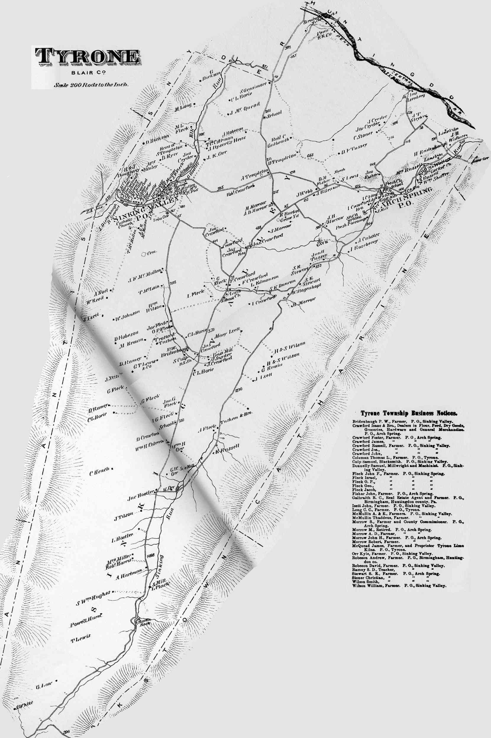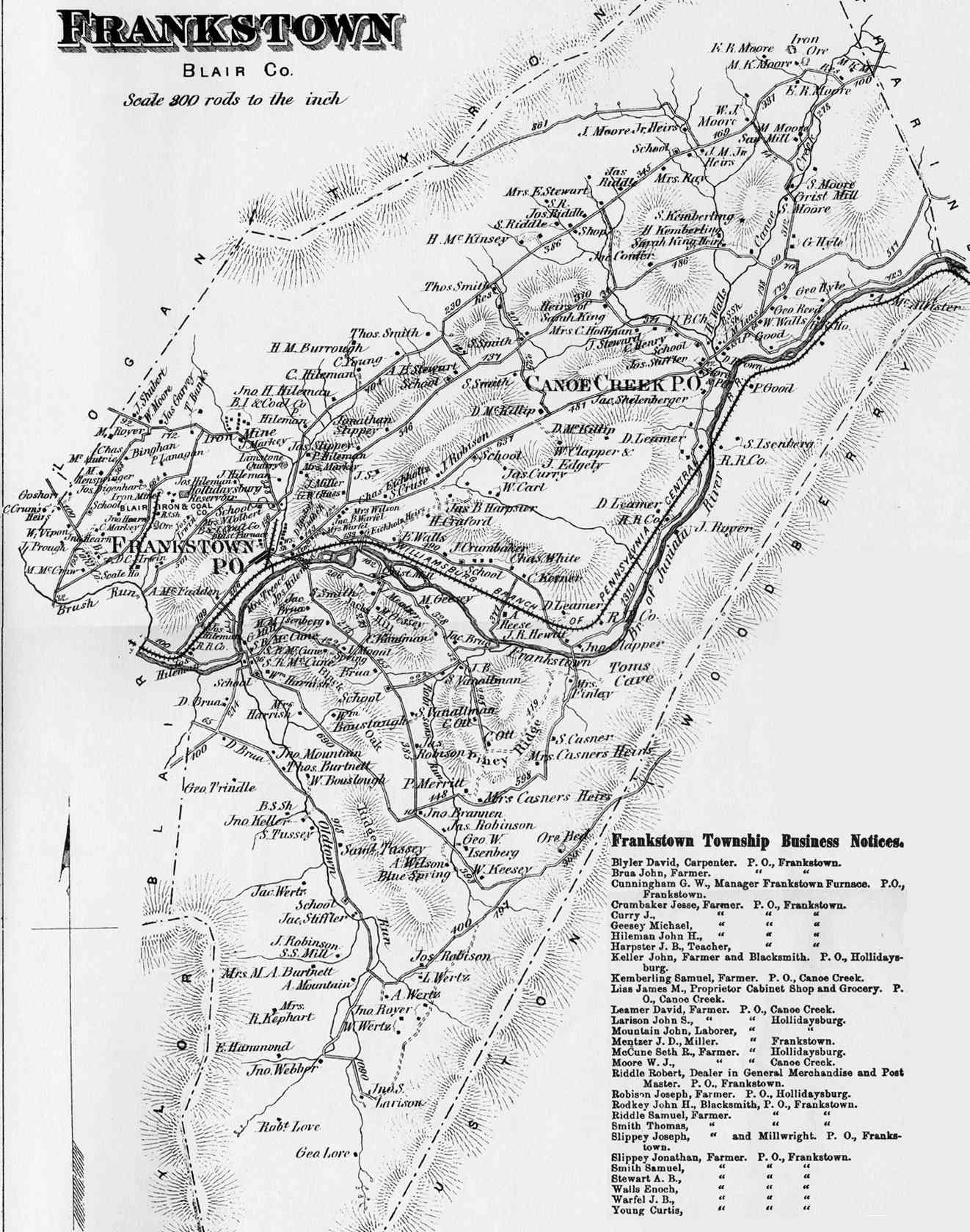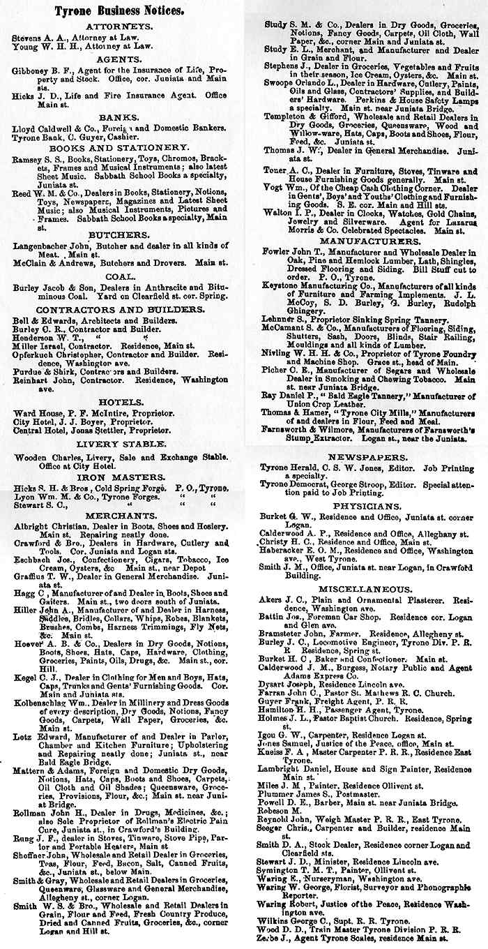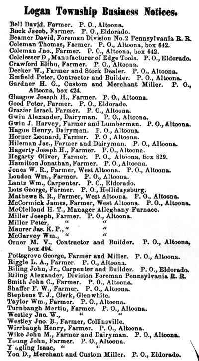 Altoona Business Claysburg (Greenfield) Calvertville (Logan) Duncansville (Allegheny) East Freedom (Freedom) East Sharpsburg (Taylor) East Tyrone (Snyder) Foot Of Ten (Allegheny) Fostoria (Antis) Frankstown (Frankstown) Hollidaysburg (1) (Blair) Hollidaysburg(2) (Blair) Ironville (Snyder) Martinsburg (N. Woodberry) McCartneyville Newry (Blair) Roaring Springs (Taylor) Tyrone Forge (Snyder) Tyrone (Snyder) Tyrone Business Williamsburg (Woodberry) |