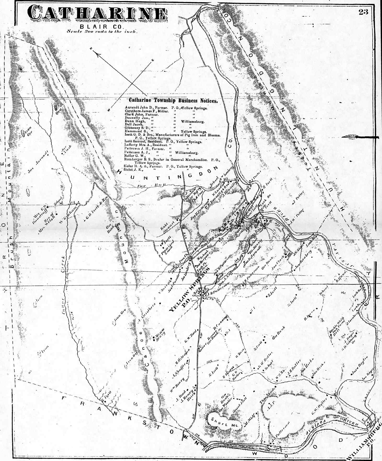 ATLAS of BLAIR AND HUNTINGDON COUNTIES PENNSYLVANIA From actual Surveys by and under the direction of BEACH NICHOLS Published by A. POMEROY & Co. 31 So. Sixth St. PHILADELPHIA 1873. Eng'd. by Worley & Beacher 31 So. Sixth St. Philad'a. Printed by F. Bourquin 31 So. Sixth St. Philad'a. Entered according to act of Congress in the year 1873 by a. Pomeroy & Co. in the Office of the Librarian of Congress Washington.