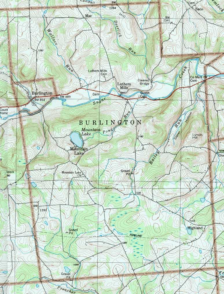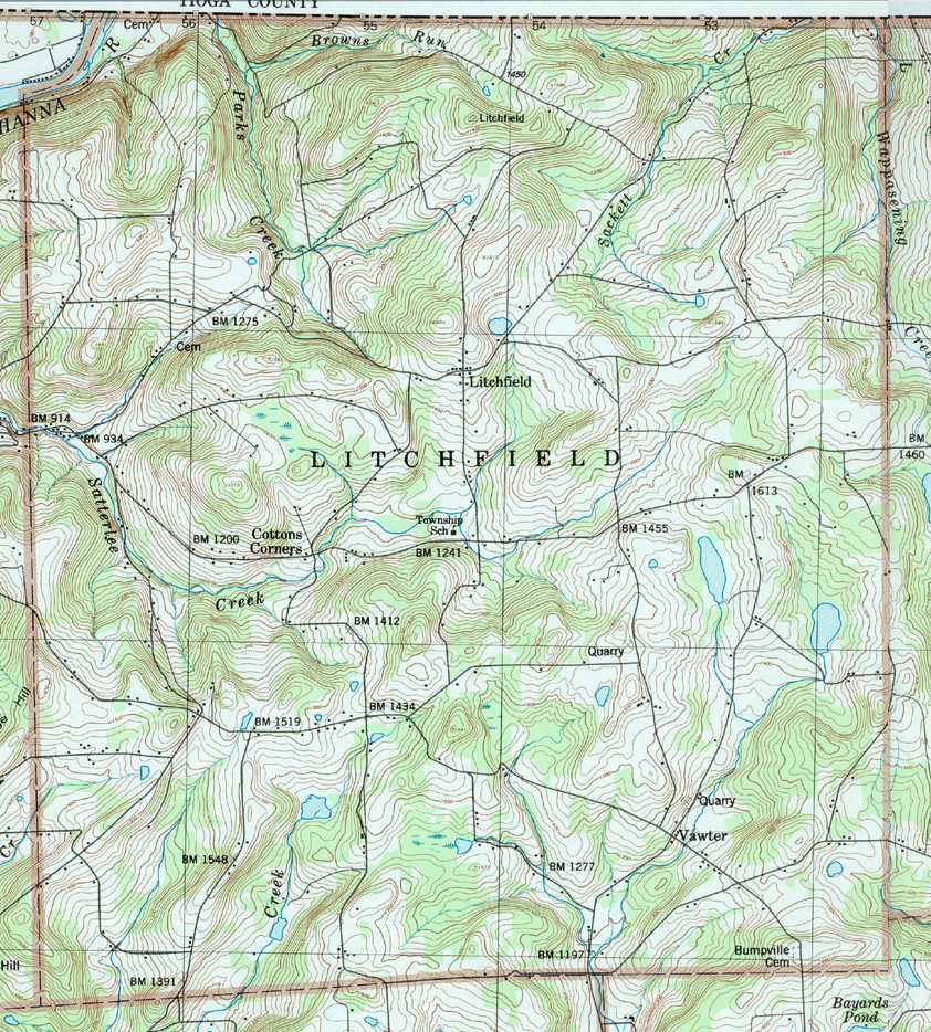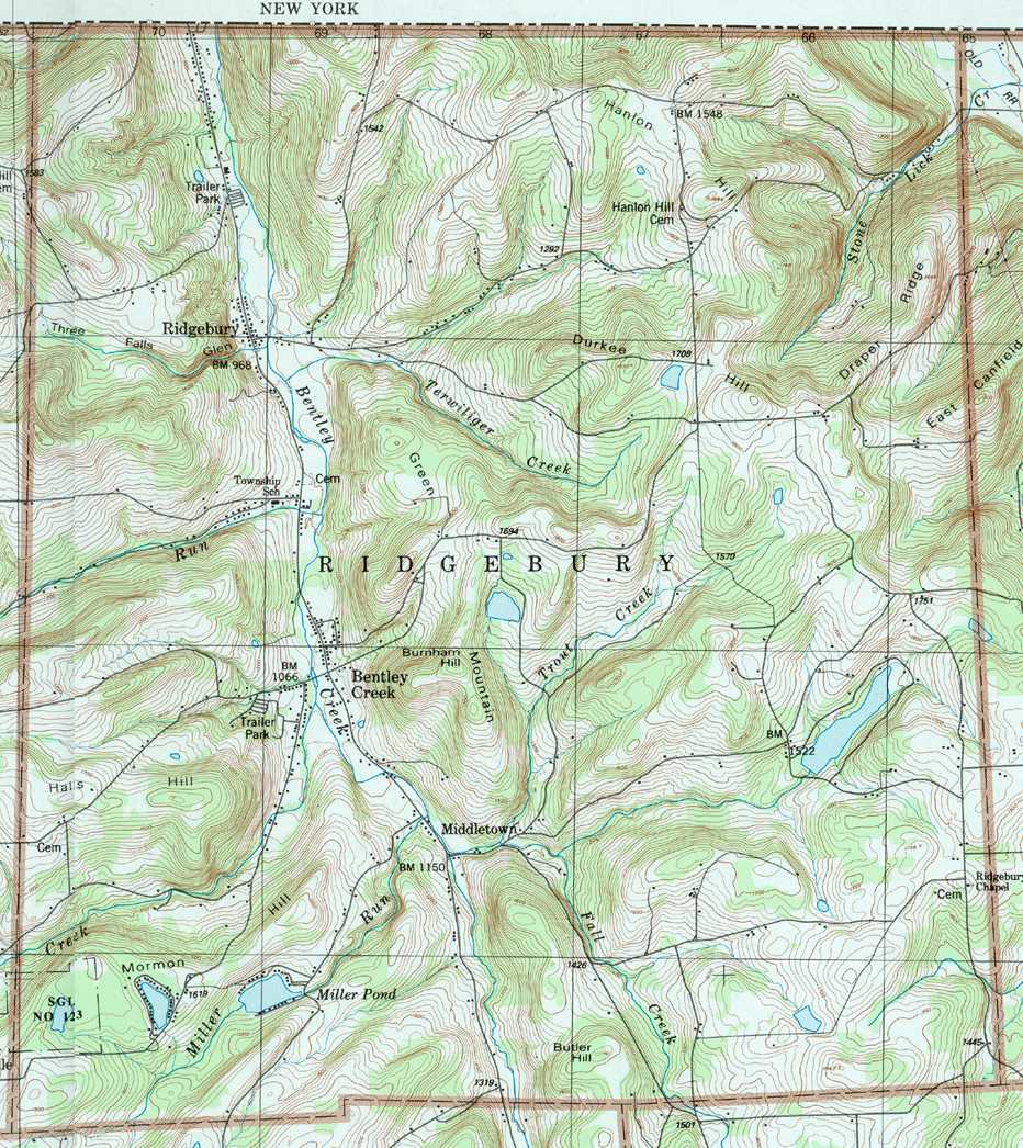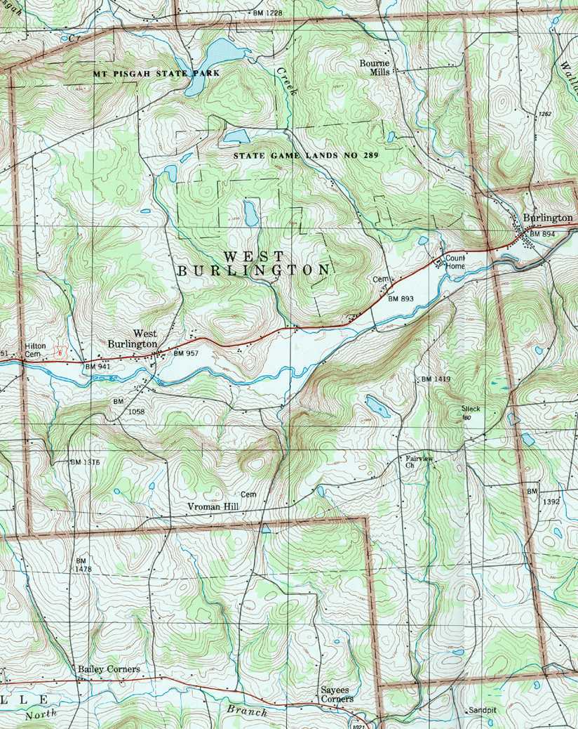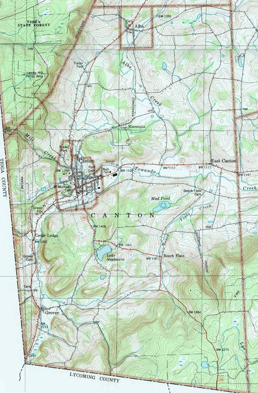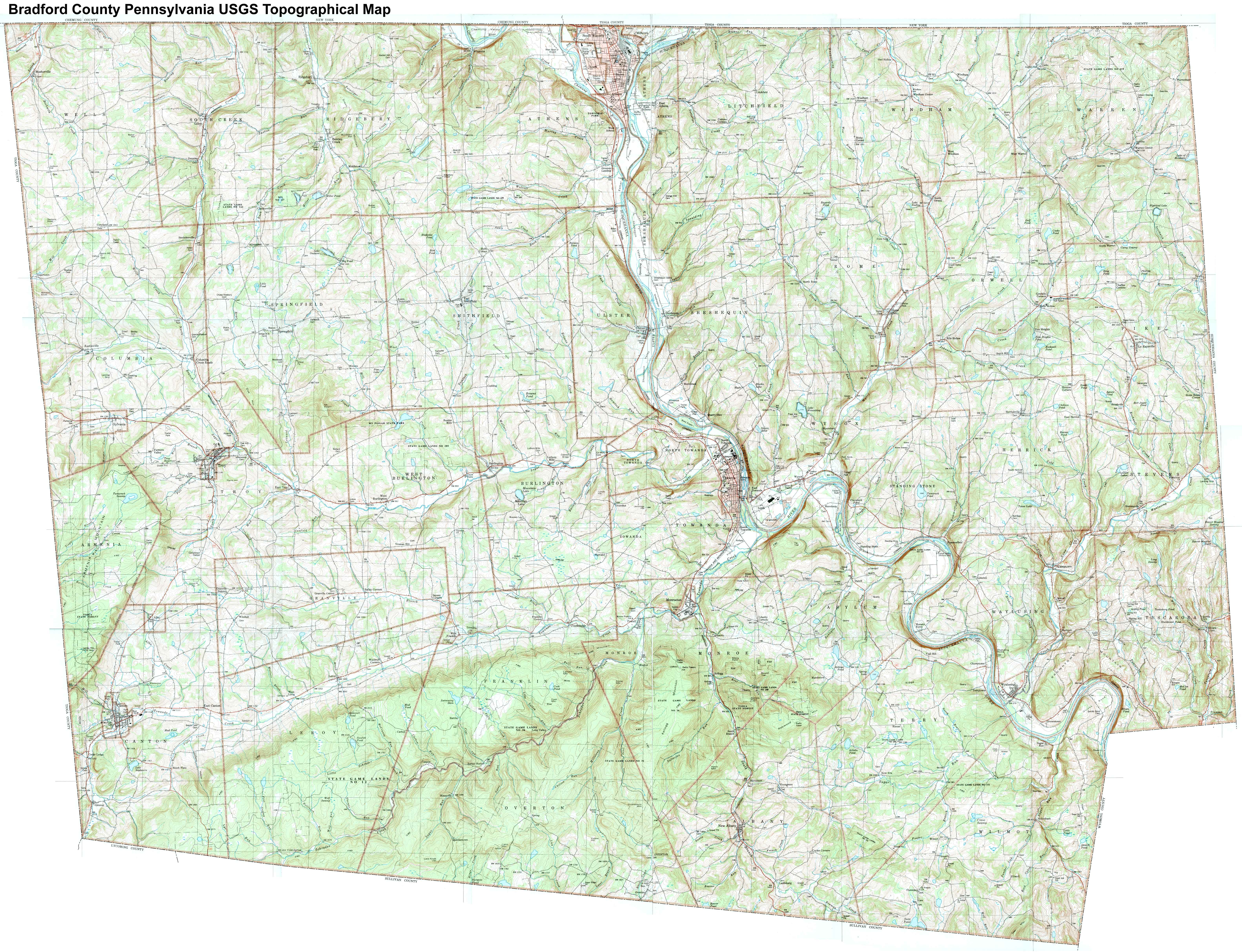 Image Map: This is a clickable image map of townships and boroughs in Bradford County Pennsylvania. A text list of the township maps is shown below. The township images are cropped from a 1/50,000 USGS Geological Survey Map of Bradford County dated 1987; based on 1/24,000 maps dated 1945 (69PR) through 1970. Adjacent counties shown on the image map have active links to their USGS maps. County Genealogy Sites: There are links to Pennsylvania county USGenWeb sites at the bottom of the Pennsylvania Map Index page. To see the whole county map click here (4.5MB). Tri-Counties Genealogy & History (Bradford and Tioga Counties in PA and Chemung County, NY) |