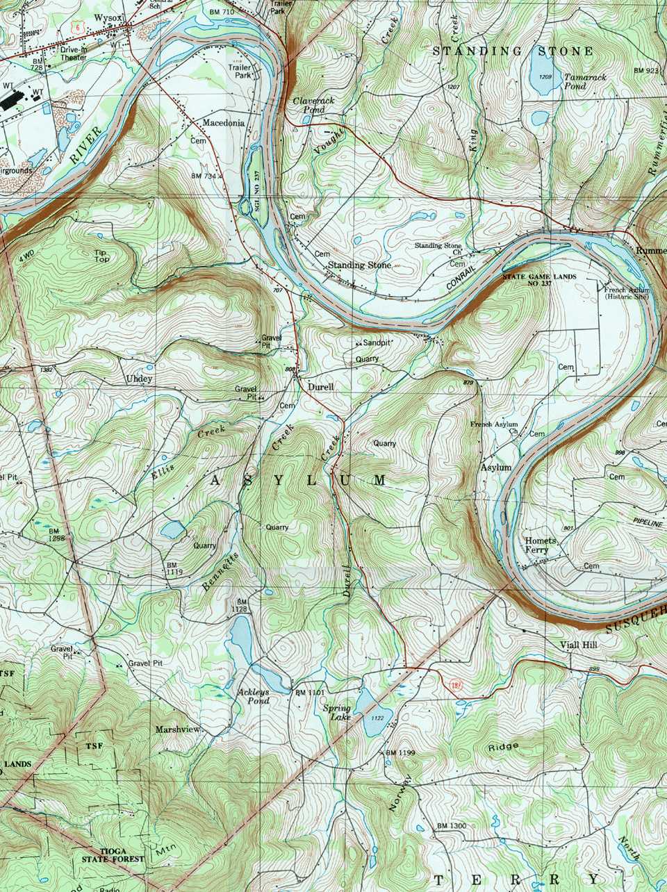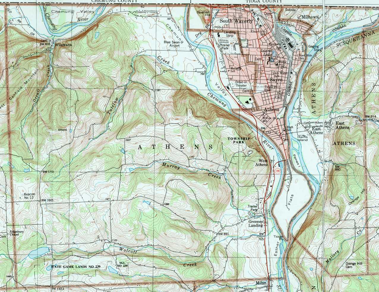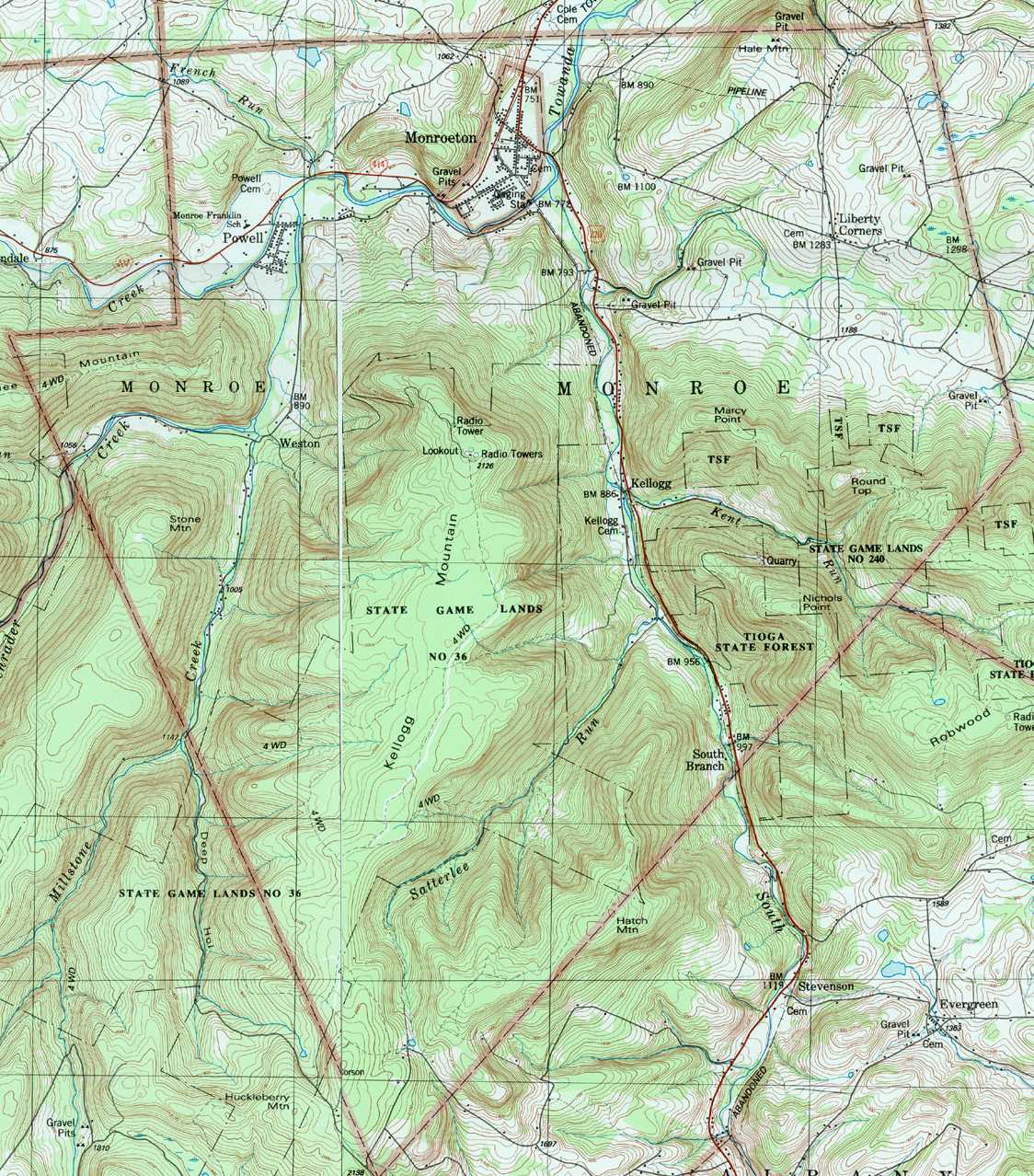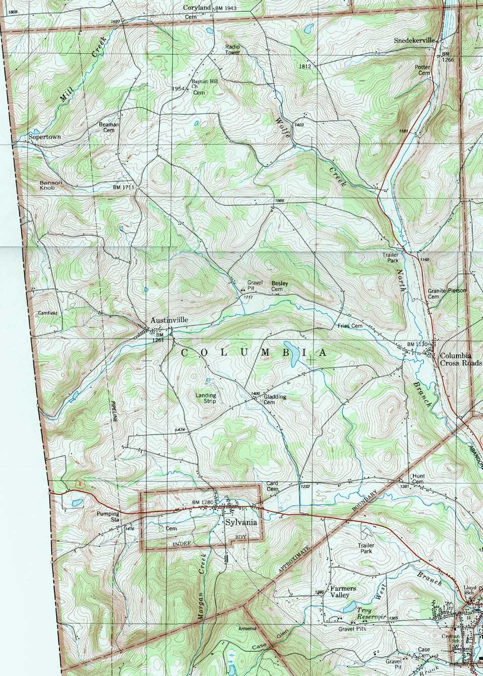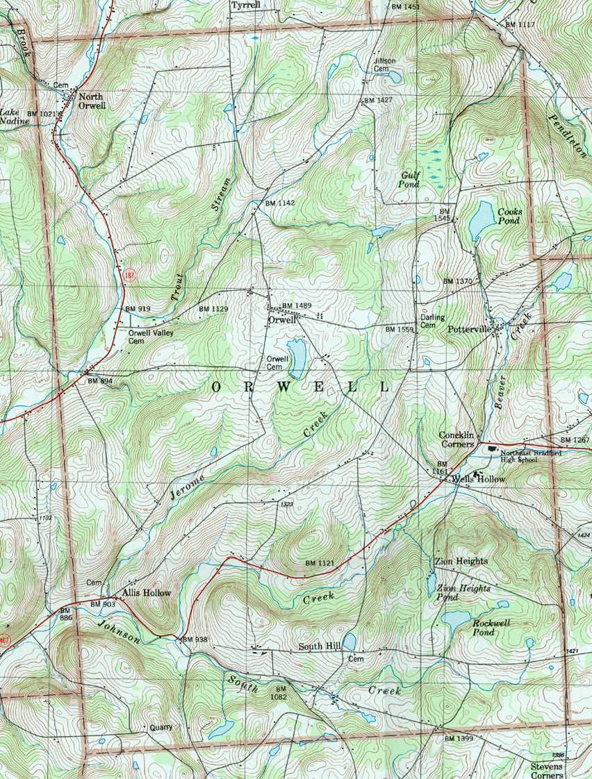 Image Map: This is a clickable image map of townships and boroughs in Bradford County Pennsylvania. A text list of the township maps is shown below. The township images are cropped from a 1/50,000 USGS Geological Survey Map of Bradford County dated 1987; based on 1/24,000 maps dated 1945 (69PR) through 1970. Adjacent counties shown on the image map have active links to their USGS maps. County Genealogy Sites: There are links to Pennsylvania county USGenWeb sites at the bottom of the Pennsylvania Map Index page. To see the whole county map click here (4.5MB). Tri-Counties Genealogy & History (Bradford and Tioga Counties in PA and Chemung County, NY) |