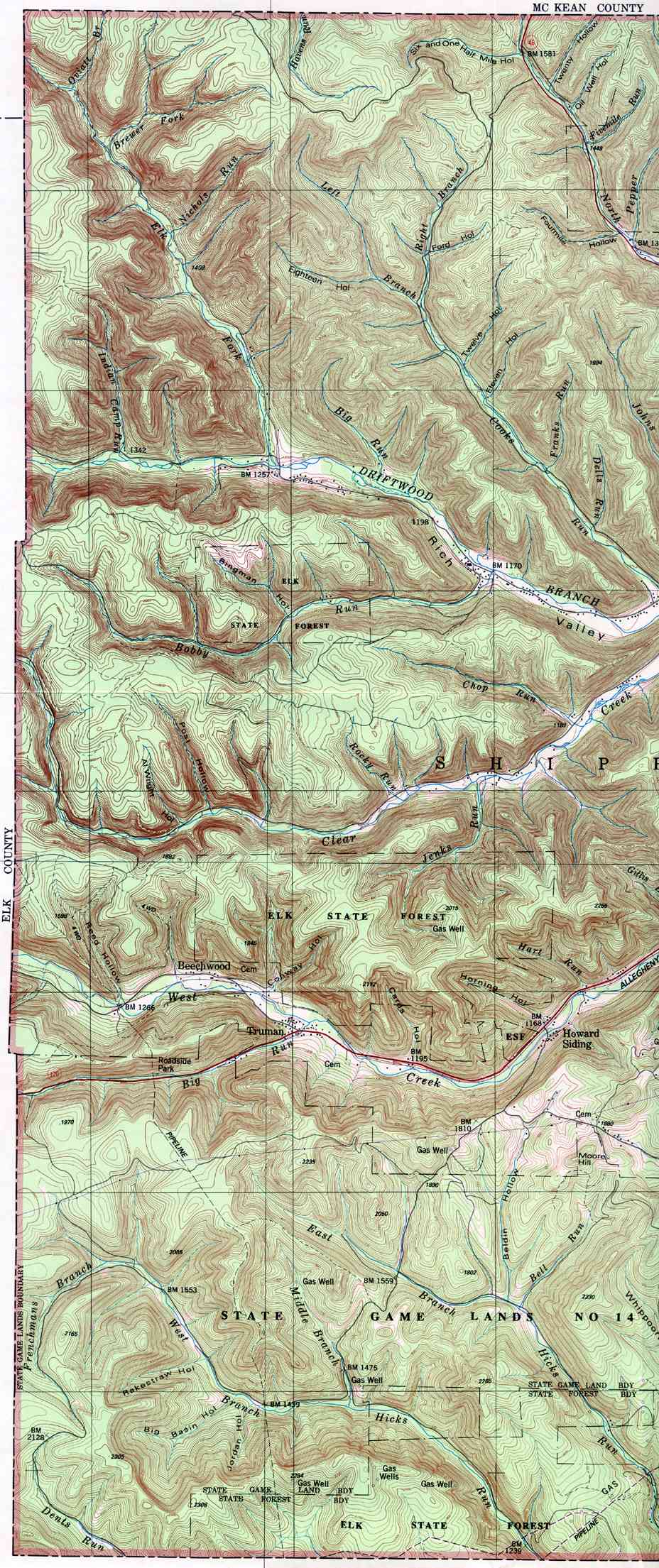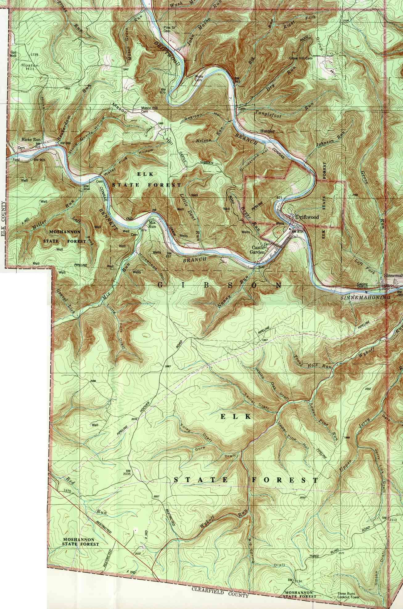 - Gibson, Castle Garden, Driftwood, Hicks Run, Huntley, Mix Run,