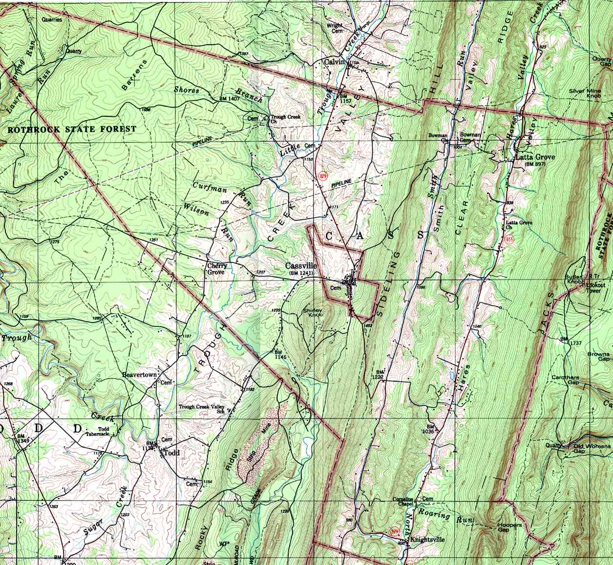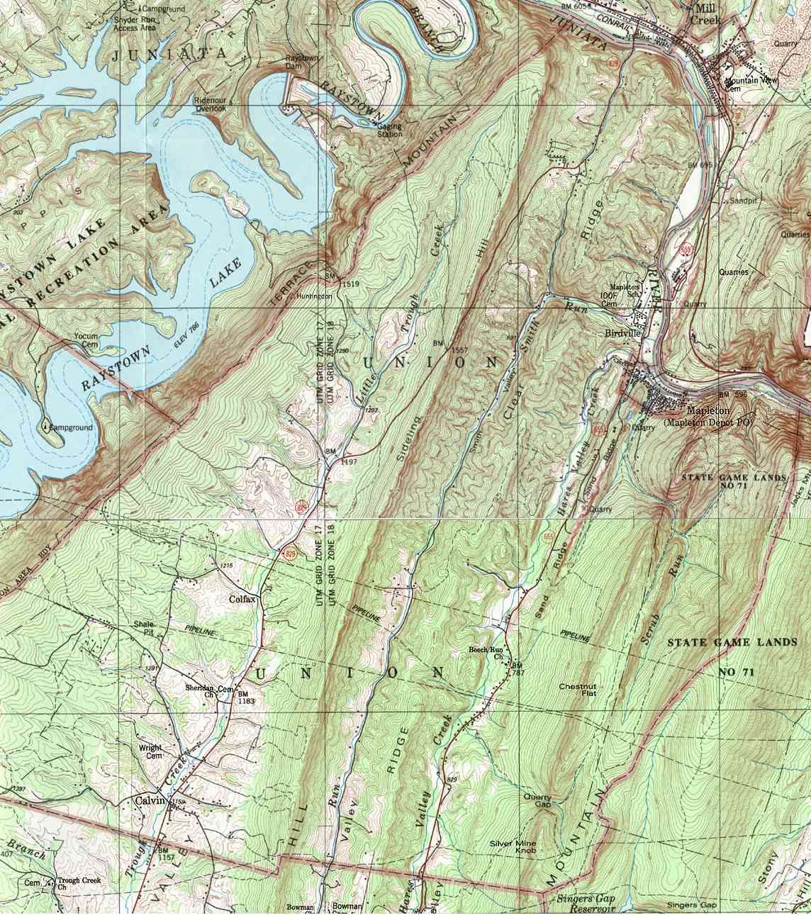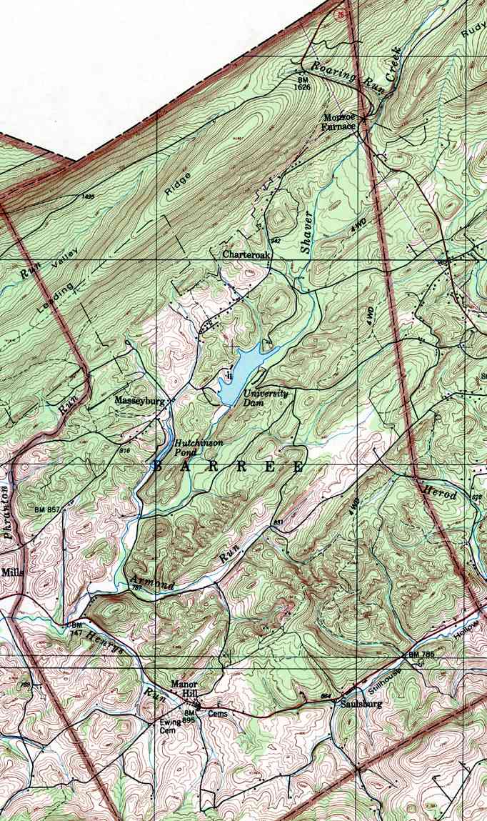 - Barree, Charteroak, Hutchison Pond, Manor Hill, Masseyburg, Monroe Furnace, Saulsburg, University Dam
