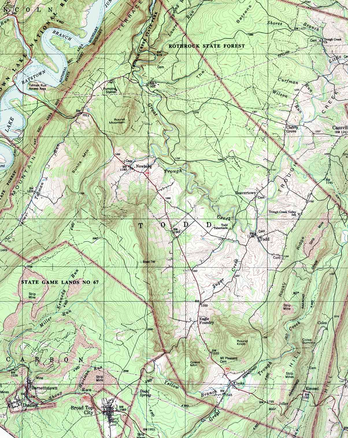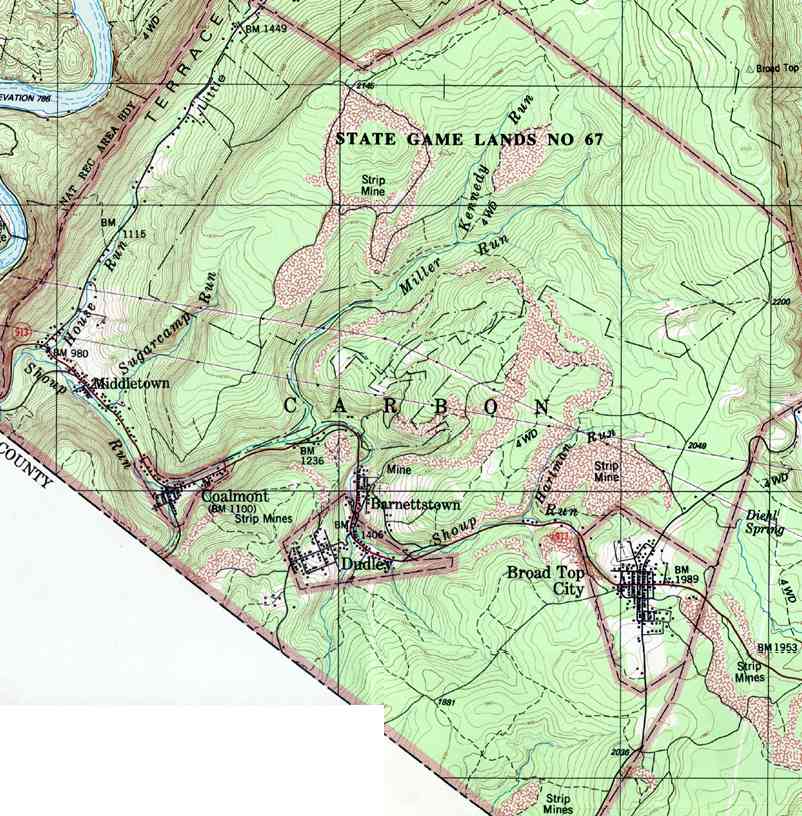 - Carbon, Barnettstown, Broad Top City, Coalmont, Dudley, Middletown,