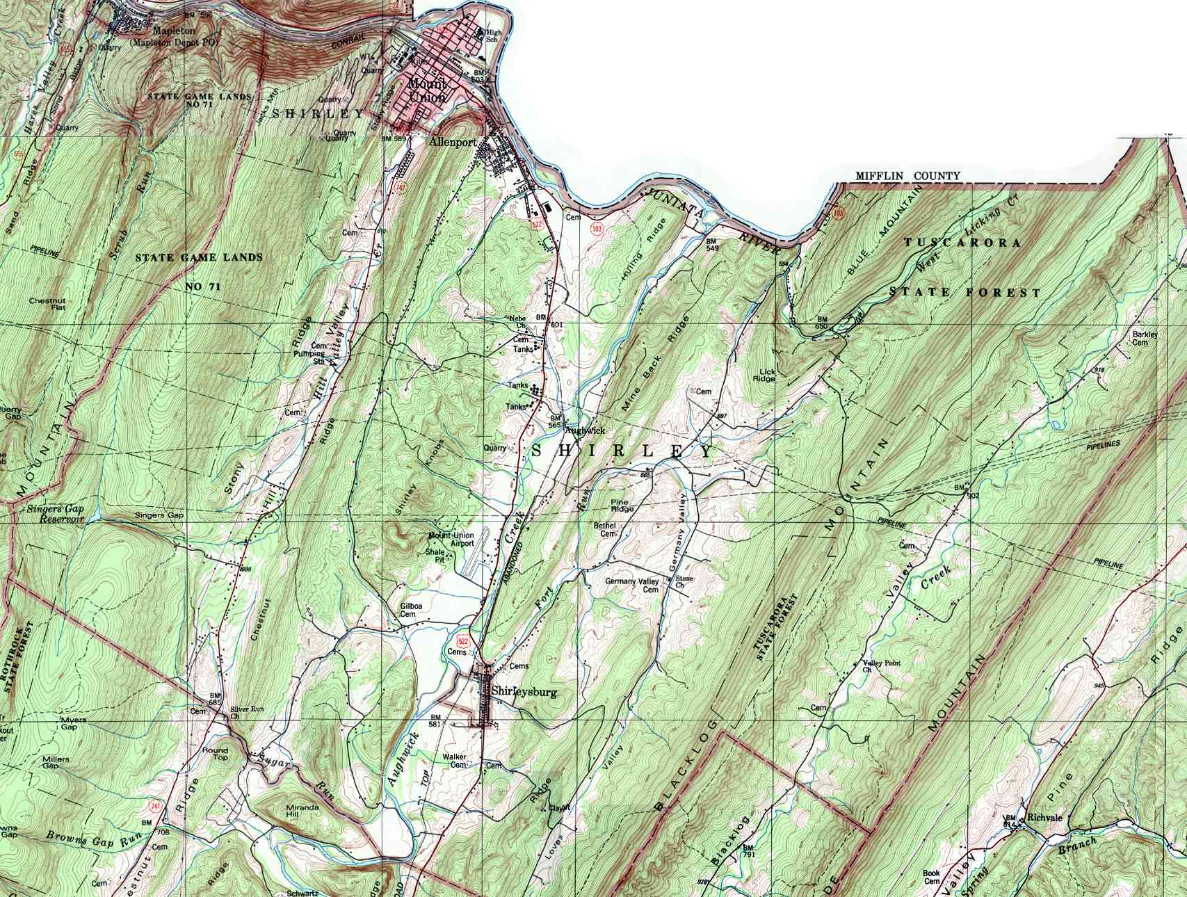 - Shirley, Allenport, Aughwick, Mount Union, Shirleysburg, Singers Gap