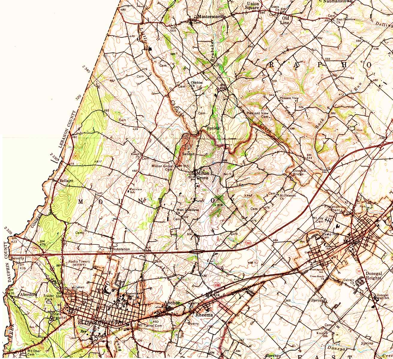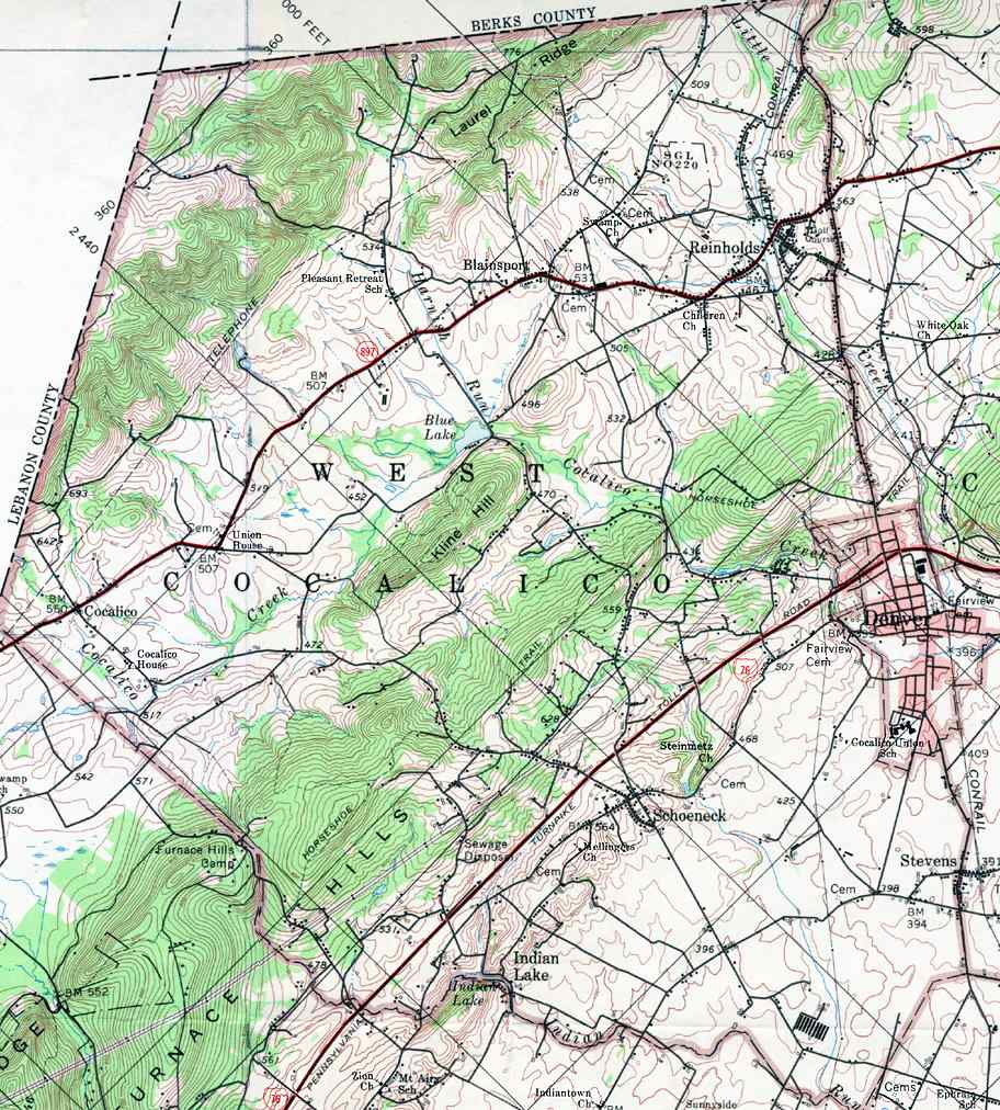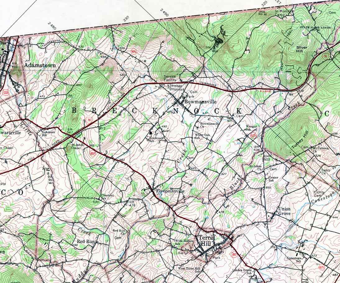 The list below shows boroughs and villages within each township; however, some townships may be combined in one map. To search for cemeteries, villages and other features visit the USGS GNIS site. Check here for information on how to order US Geological Survey Maps of Pennsylvania counties.