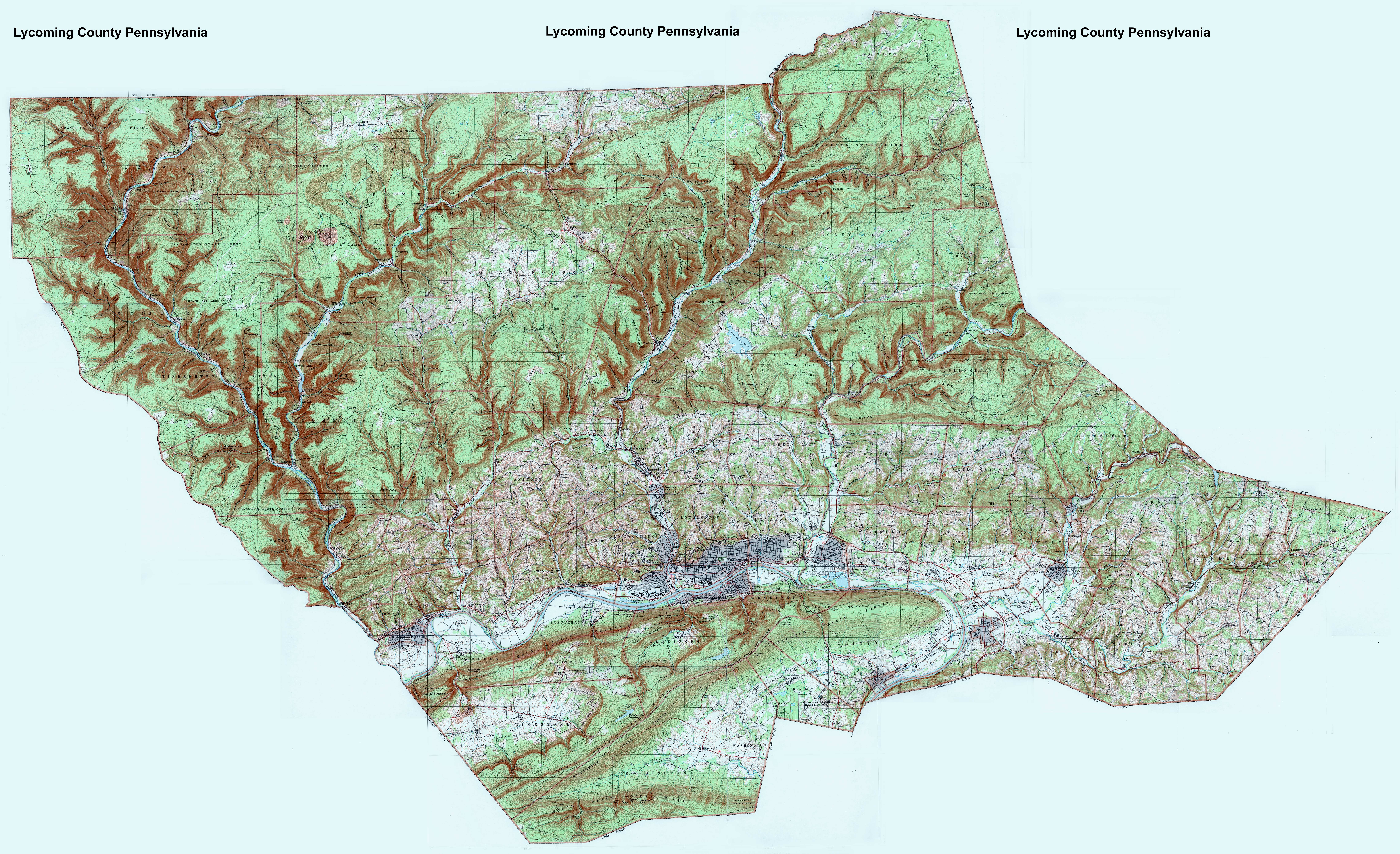 Image Map: This is a clickable image map of townships and boroughs in Lycoming County Pennsylvania. A text list of the township maps is shown below. The township images are cropped from a 1/50,000 USGS Geological Survey Map of Lycoming County dated 1993; based on 1/24,000 maps dated 1946 through 1970. The adjacent counties shown on the image map are links to their USGS maps. The Lycoming County Map is presented in its entirety; it is about 7MB in size. |
