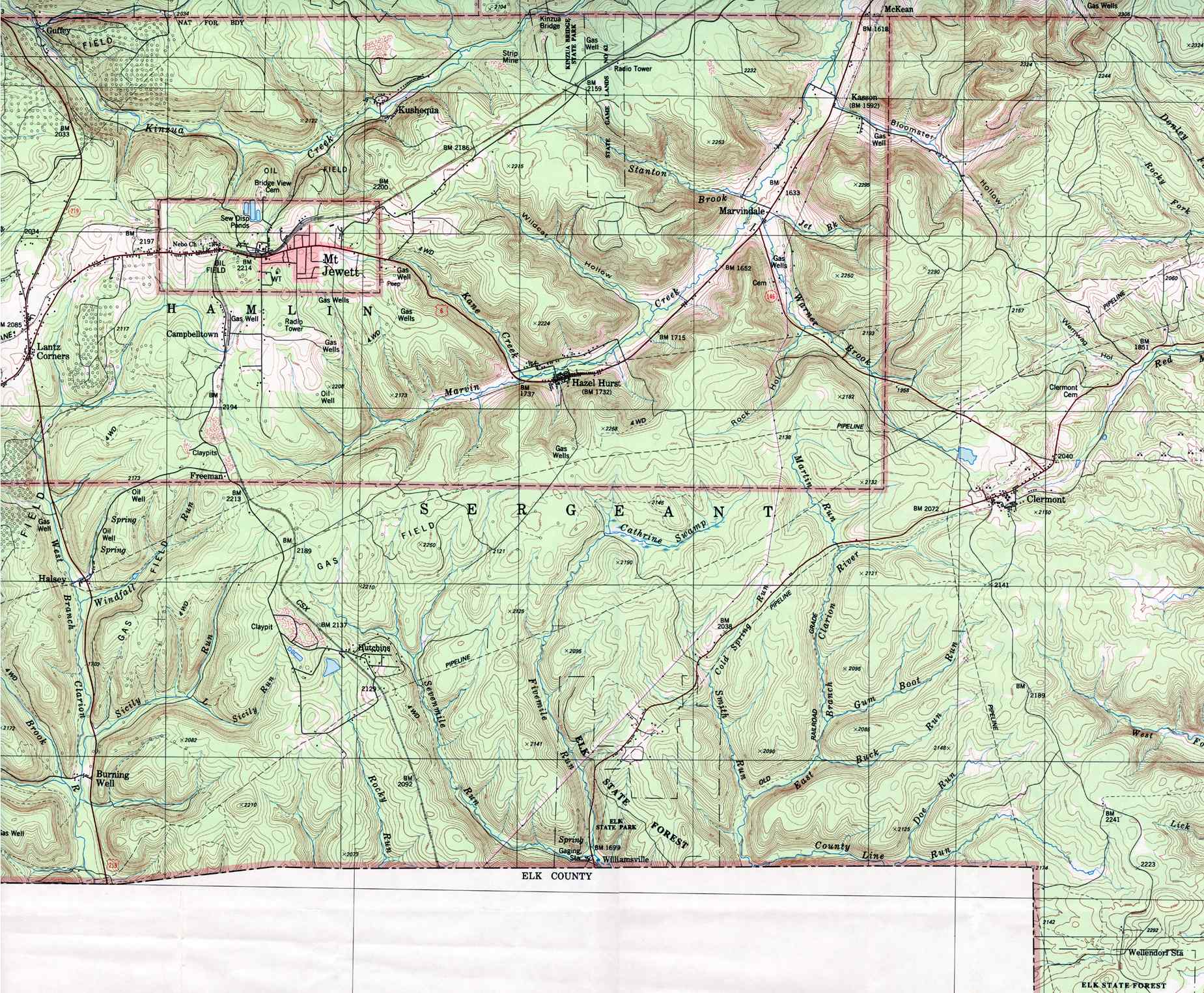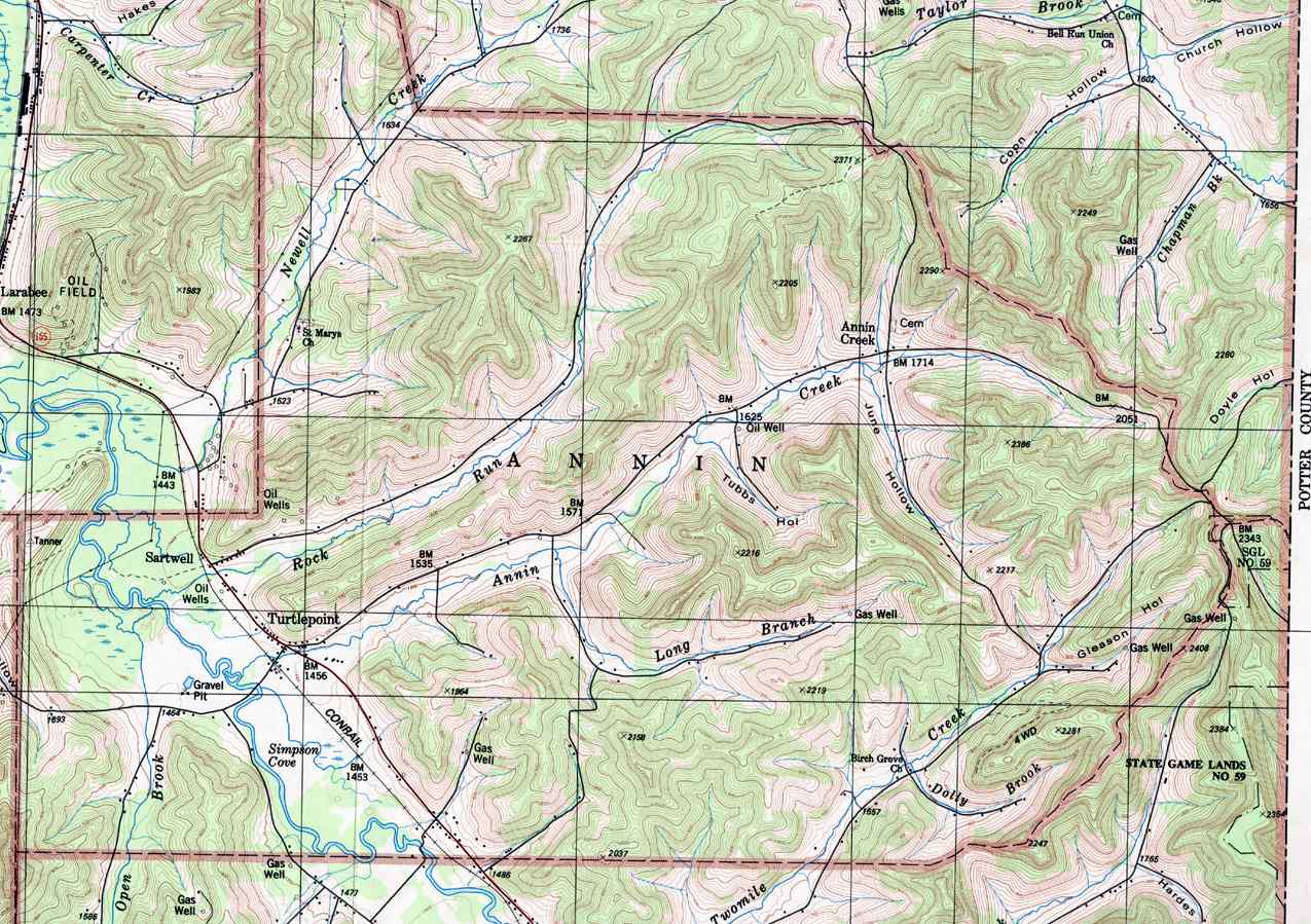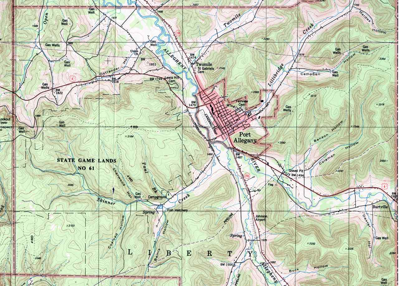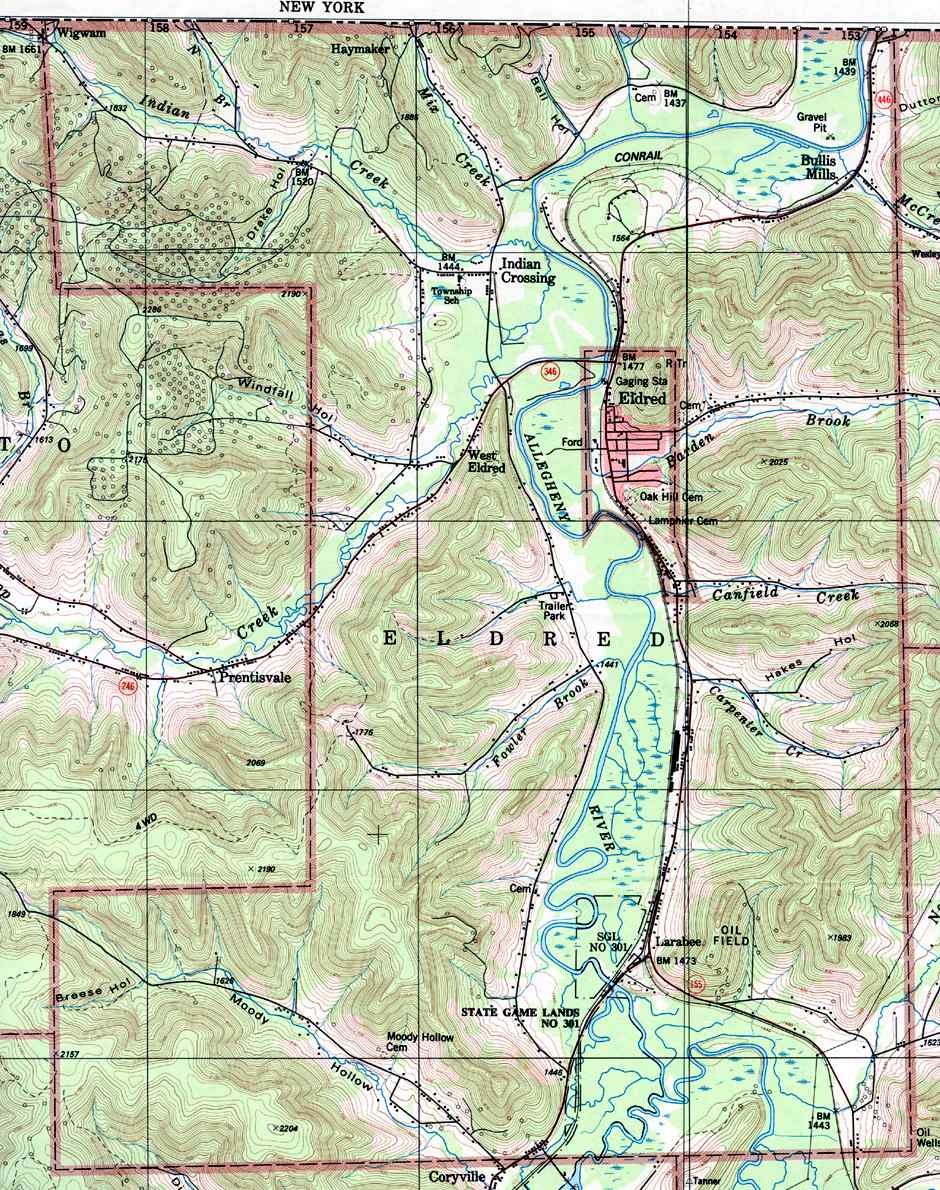 Image Map: This is a clickable image map of townships and boroughs in McKean County Pennsylvania. A text list of the township maps is shown below. The township images are cropped from a 1/50,000 USGS Geological Survey Map of McKean County dated 1987; based on 1/24,000 maps dated 1948 through 1969. The adjacent counties shown on the image map are links to their USGS maps. County Genealogy Sites: Link to Pennsylvania county USGenWeb sites at the bottom of the Pennsylvania Map Index page. |