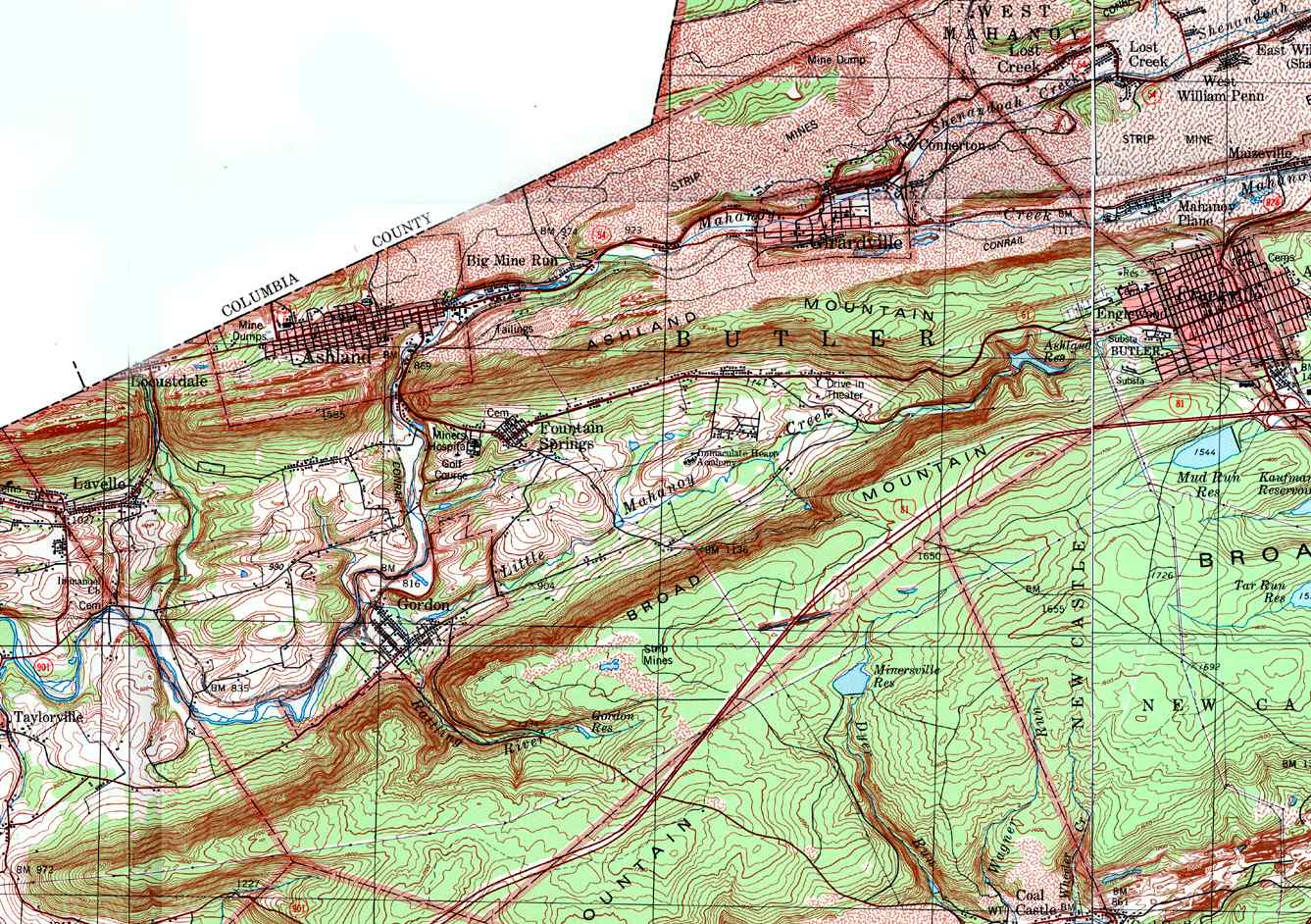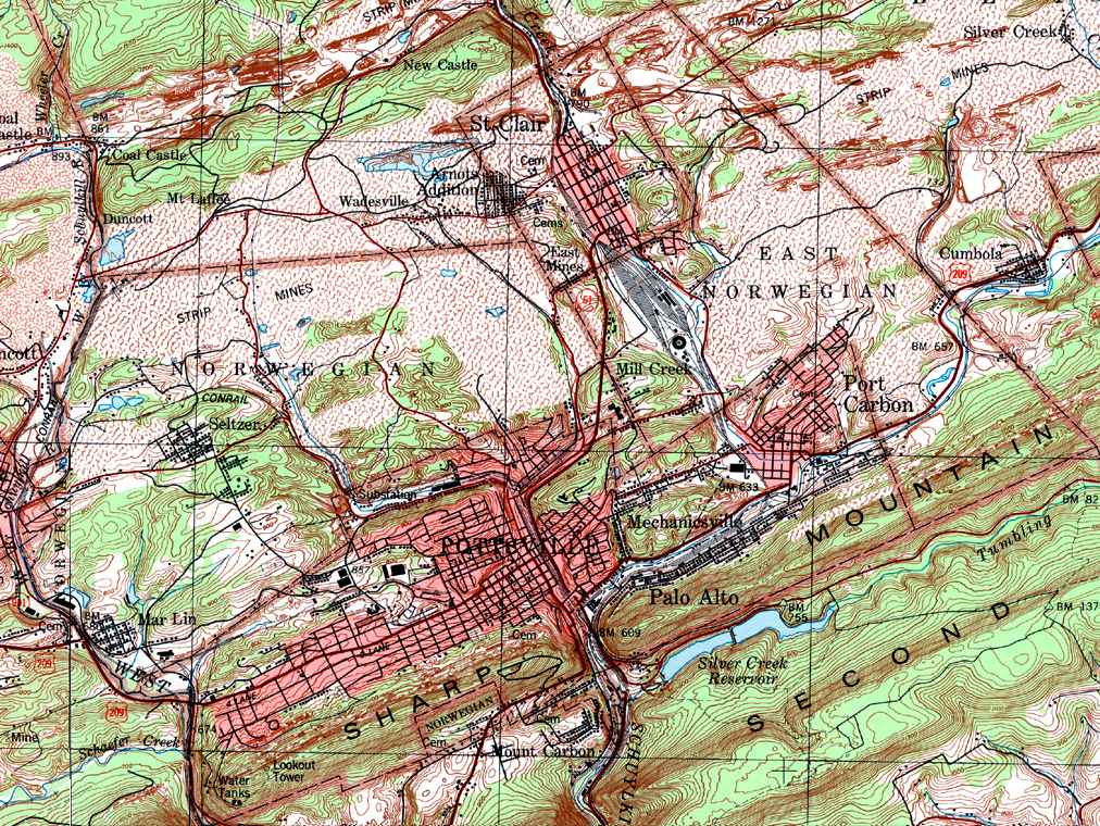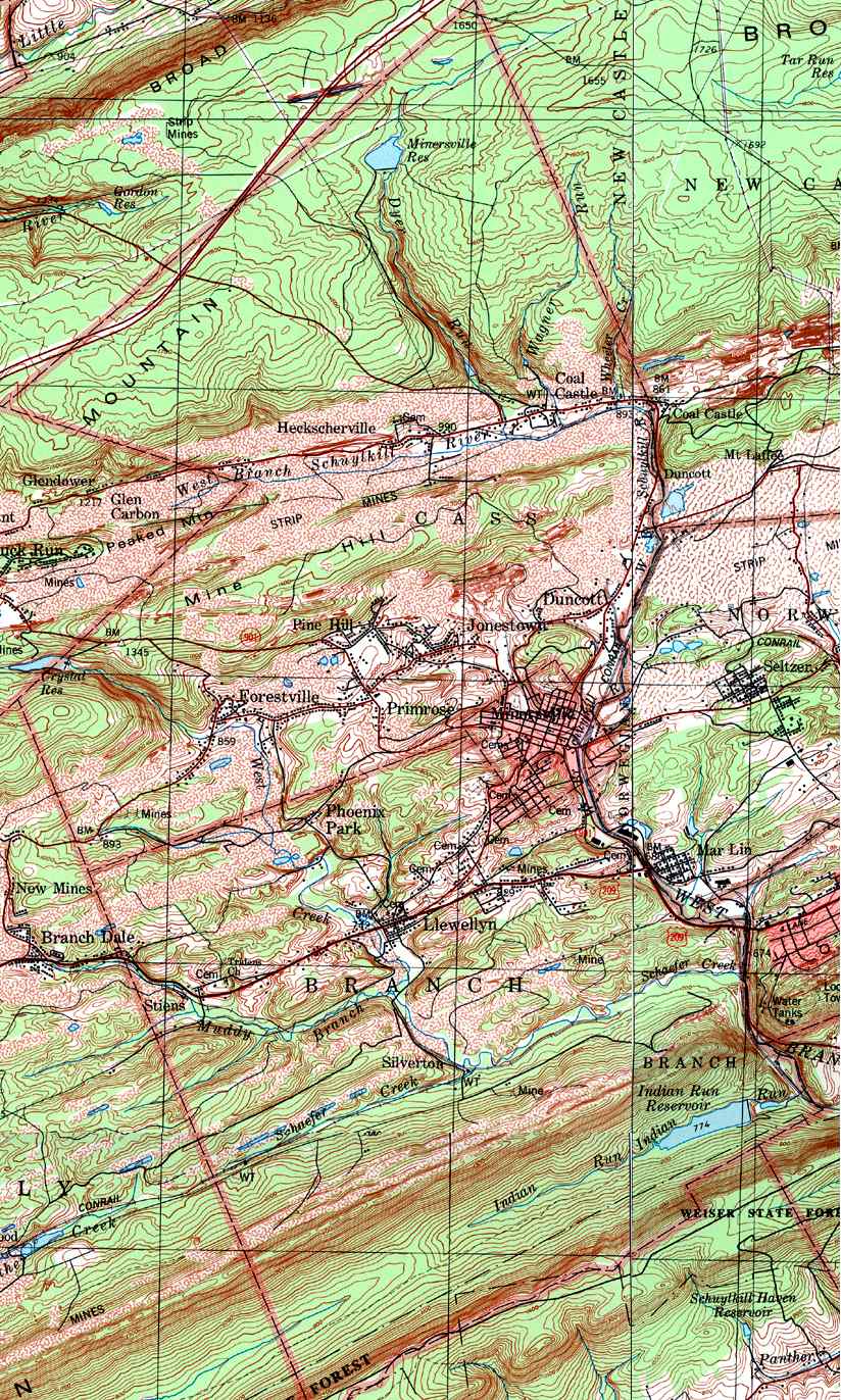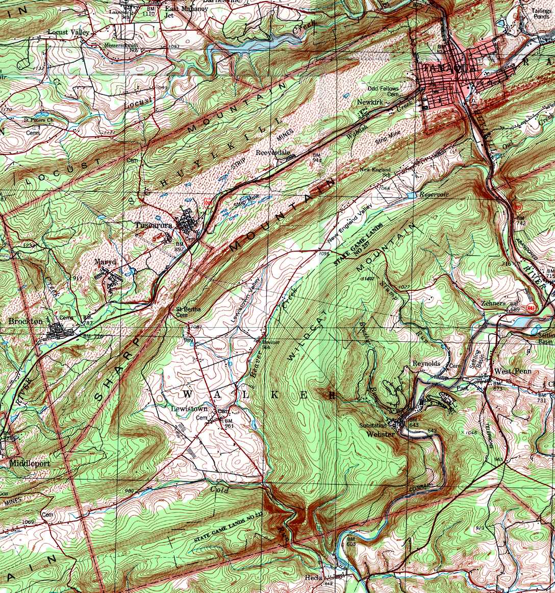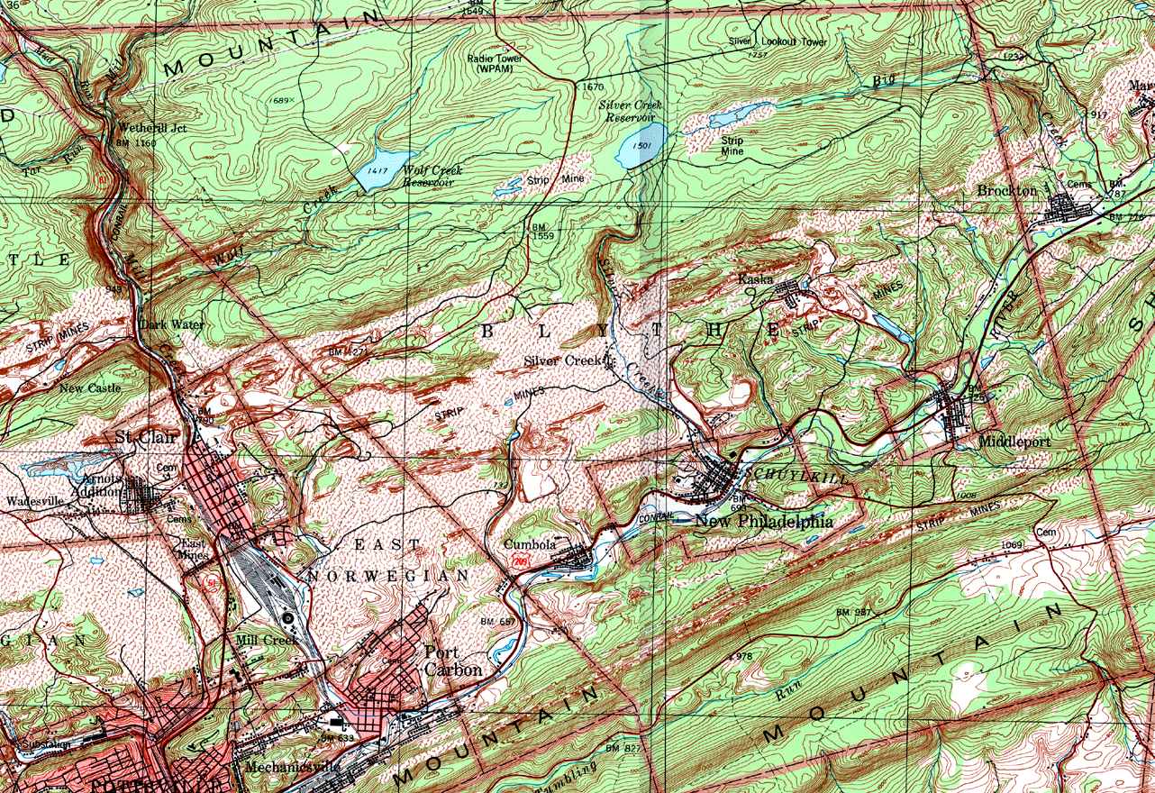 Image Map: This is a clickable image map of townships and boroughs in Schuylkill County Pennsylvania. A text list of the township maps is shown below. The township images are cropped from a 1/50,000 USGS Geological Survey Map of Schuylkill County dated 1979; based on 1/24,000 maps dated 1944 through 1969. Adjacent counties shown on the image map have active links to their USGS maps. Note that some townships are combined into one image. |