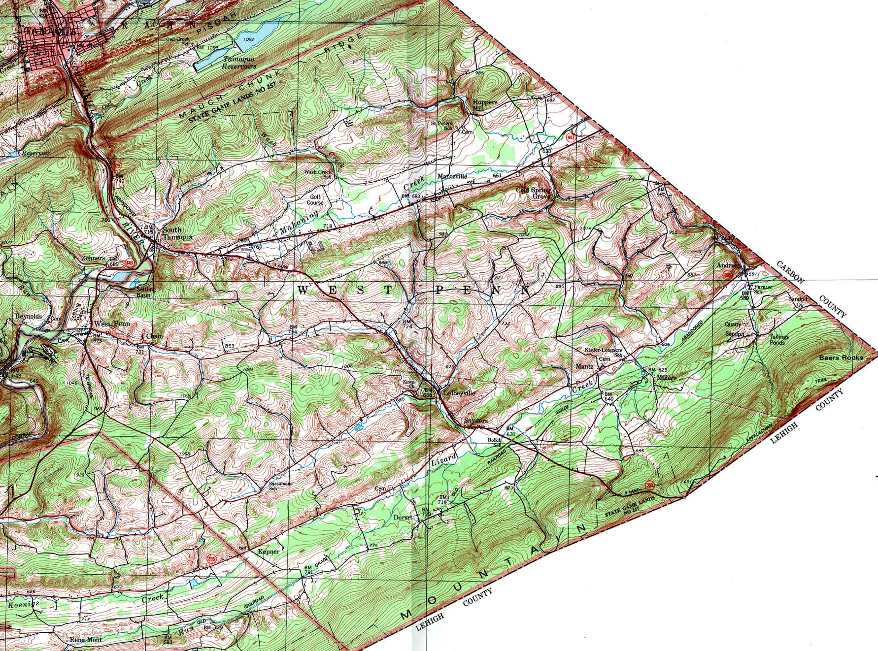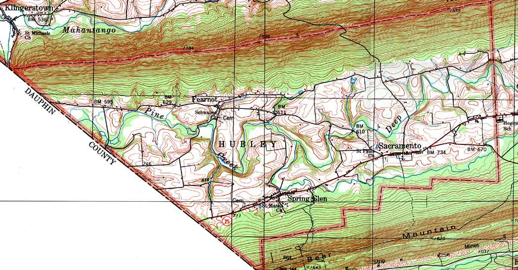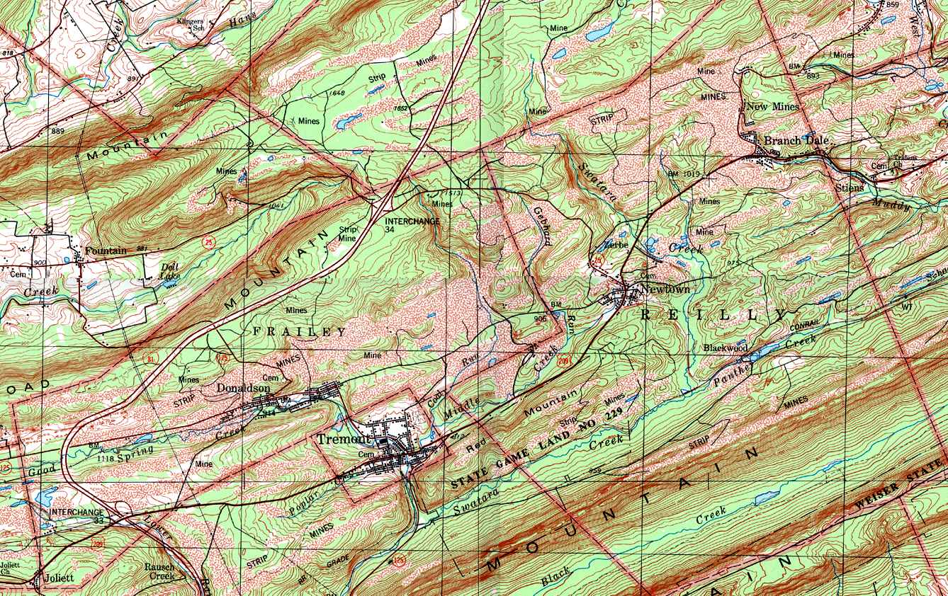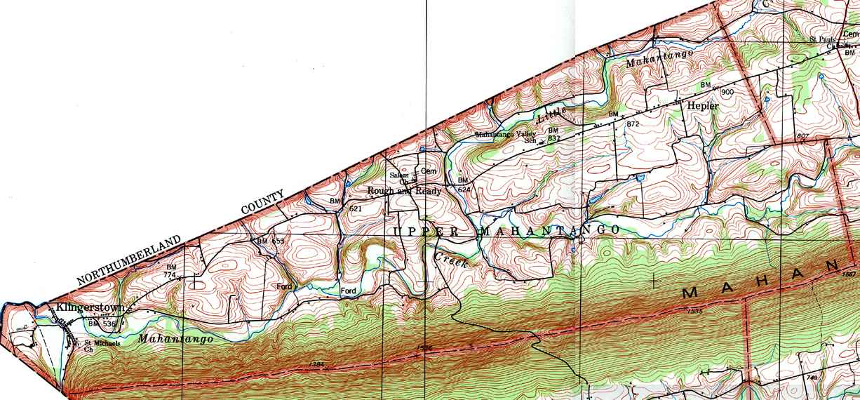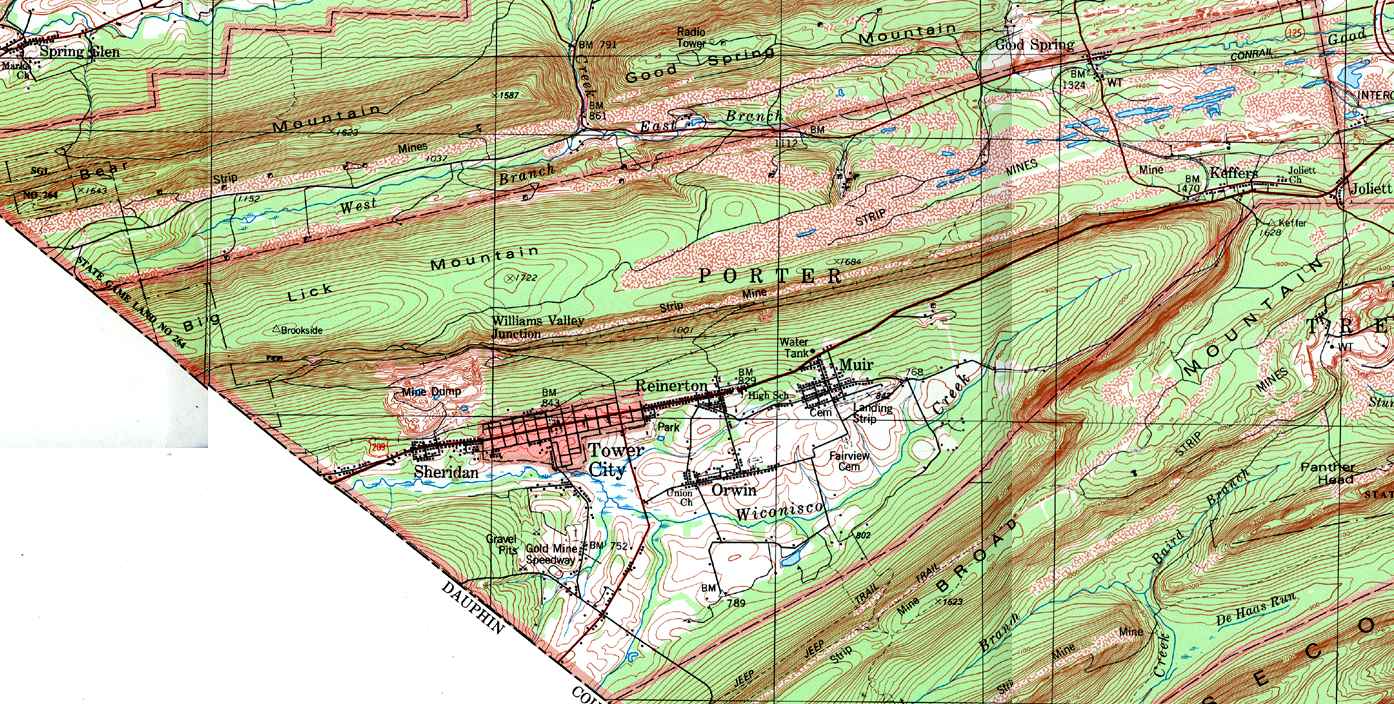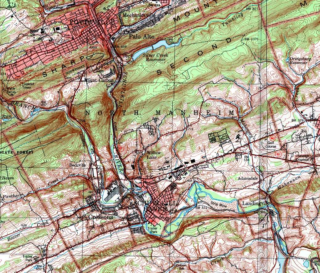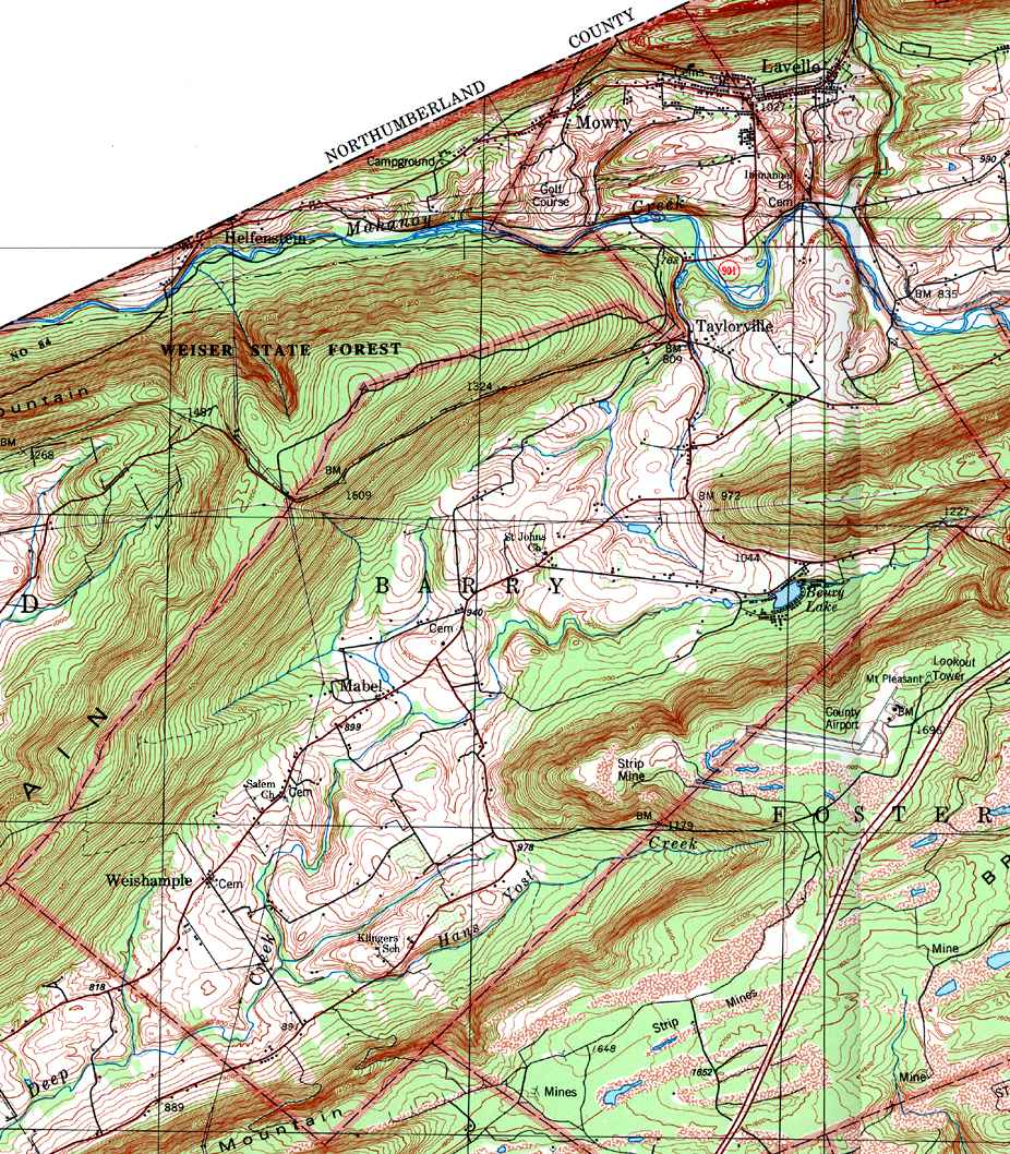 Image Map: This is a clickable image map of townships and boroughs in Schuylkill County Pennsylvania. A text list of the township maps is shown below. The township images are cropped from a 1/50,000 USGS Geological Survey Map of Schuylkill County dated 1979; based on 1/24,000 maps dated 1944 through 1969. Adjacent counties shown on the image map have active links to their USGS maps. Note that some townships are combined into one image. |