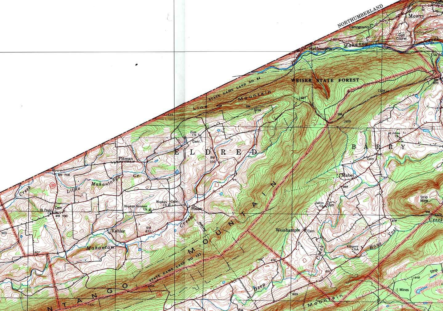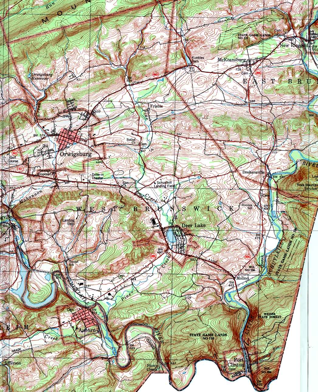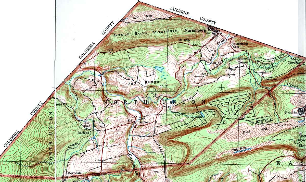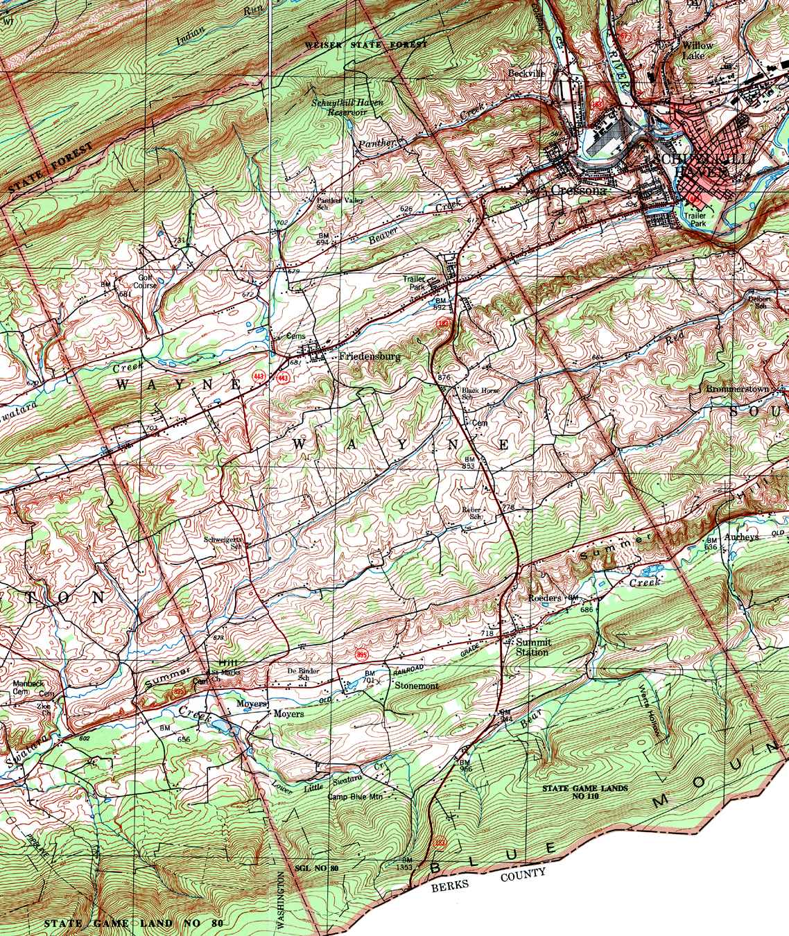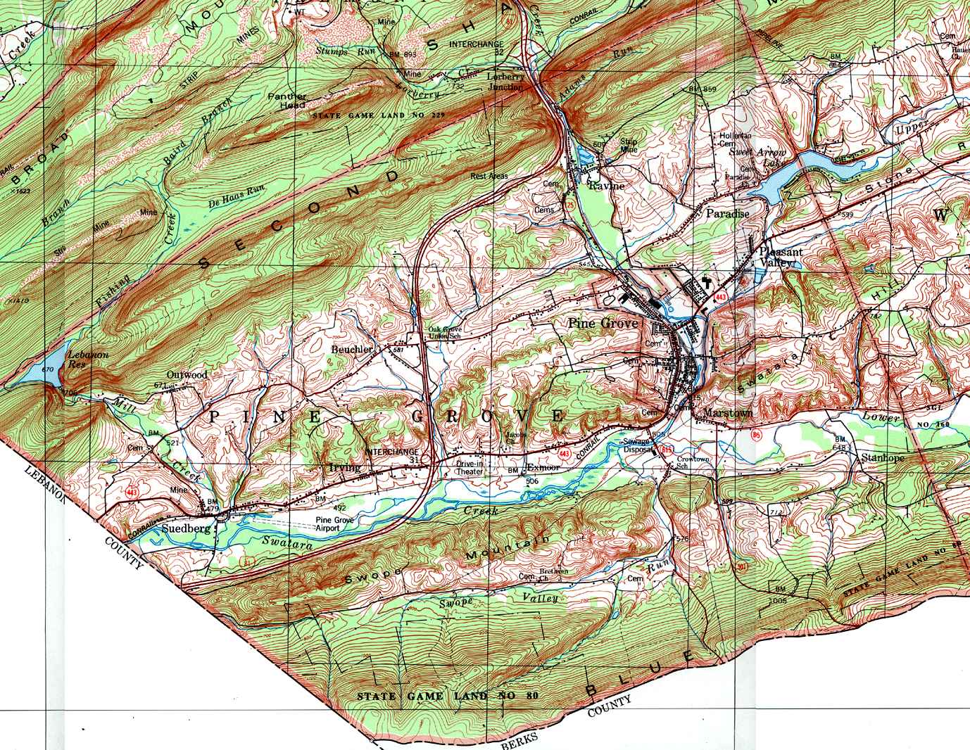 Image Map: This is a clickable image map of townships and boroughs in Schuylkill County Pennsylvania. A text list of the township maps is shown below. The township images are cropped from a 1/50,000 USGS Geological Survey Map of Schuylkill County dated 1979; based on 1/24,000 maps dated 1944 through 1969. Adjacent counties shown on the image map have active links to their USGS maps. Note that some townships are combined into one image. |