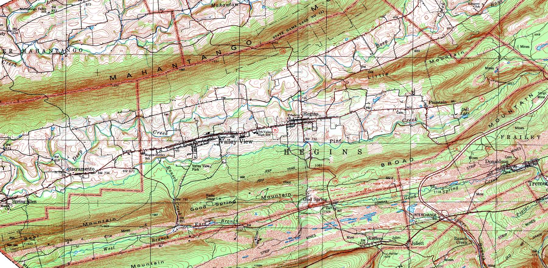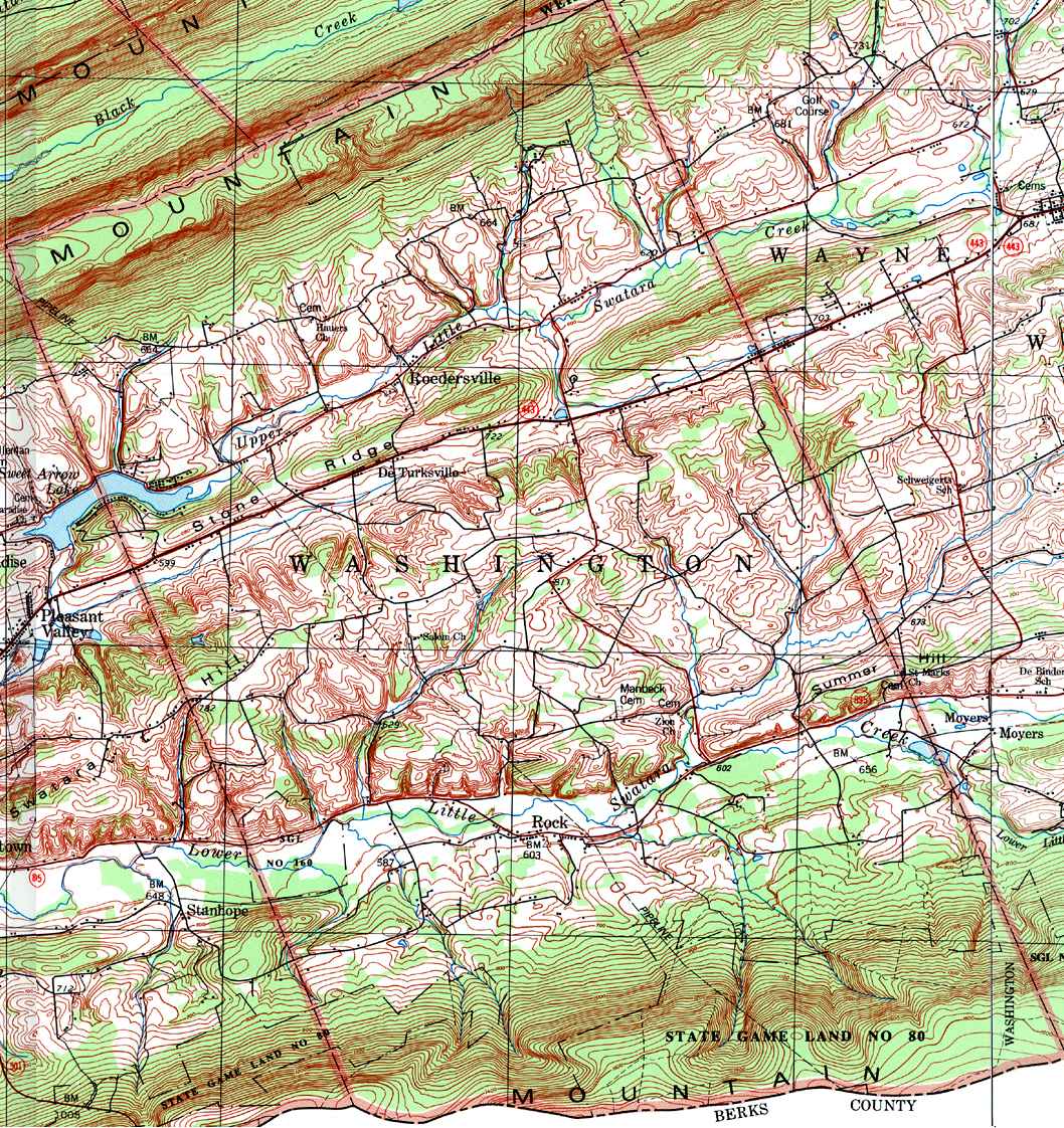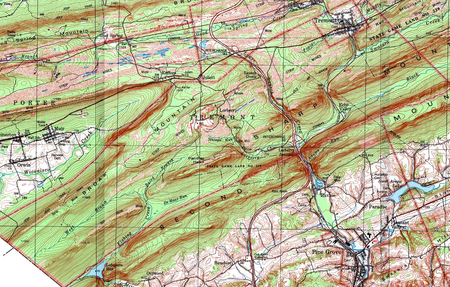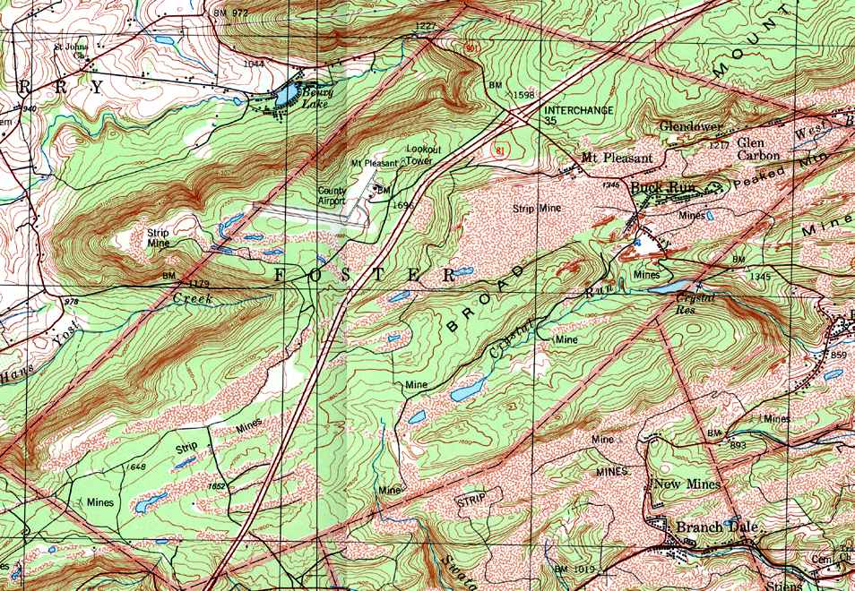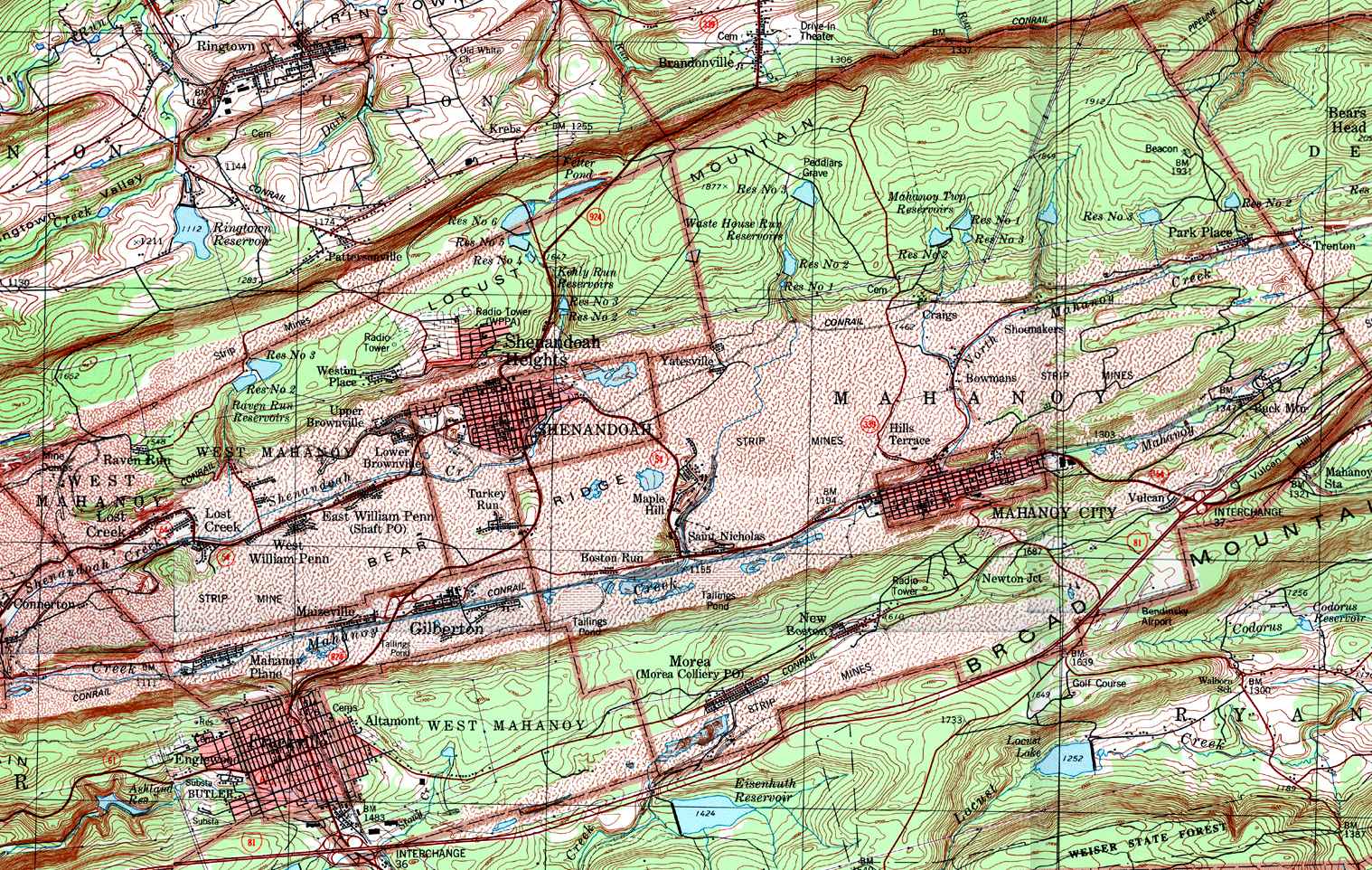 Image Map: This is a clickable image map of townships and boroughs in Schuylkill County Pennsylvania. A text list of the township maps is shown below. The township images are cropped from a 1/50,000 USGS Geological Survey Map of Schuylkill County dated 1979; based on 1/24,000 maps dated 1944 through 1969. Adjacent counties shown on the image map have active links to their USGS maps. Note that some townships are combined into one image. |