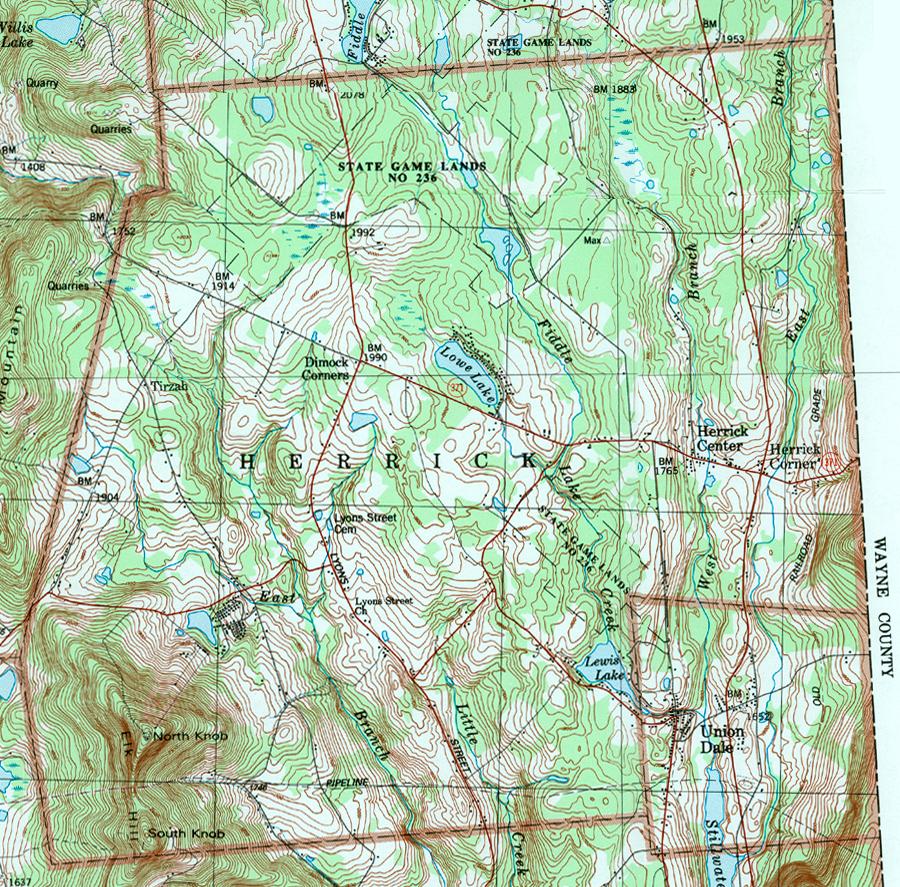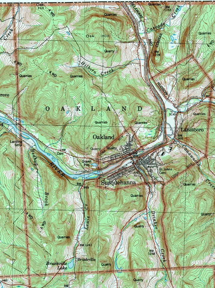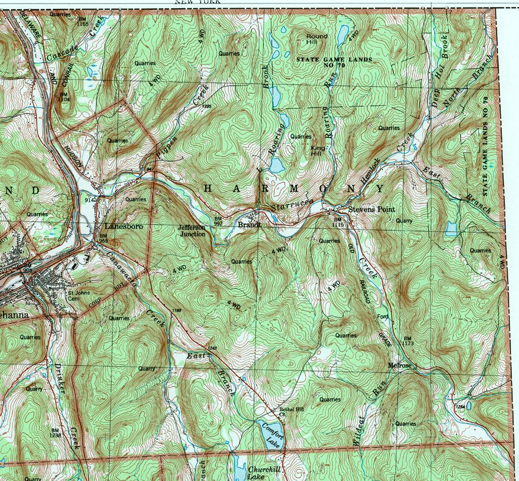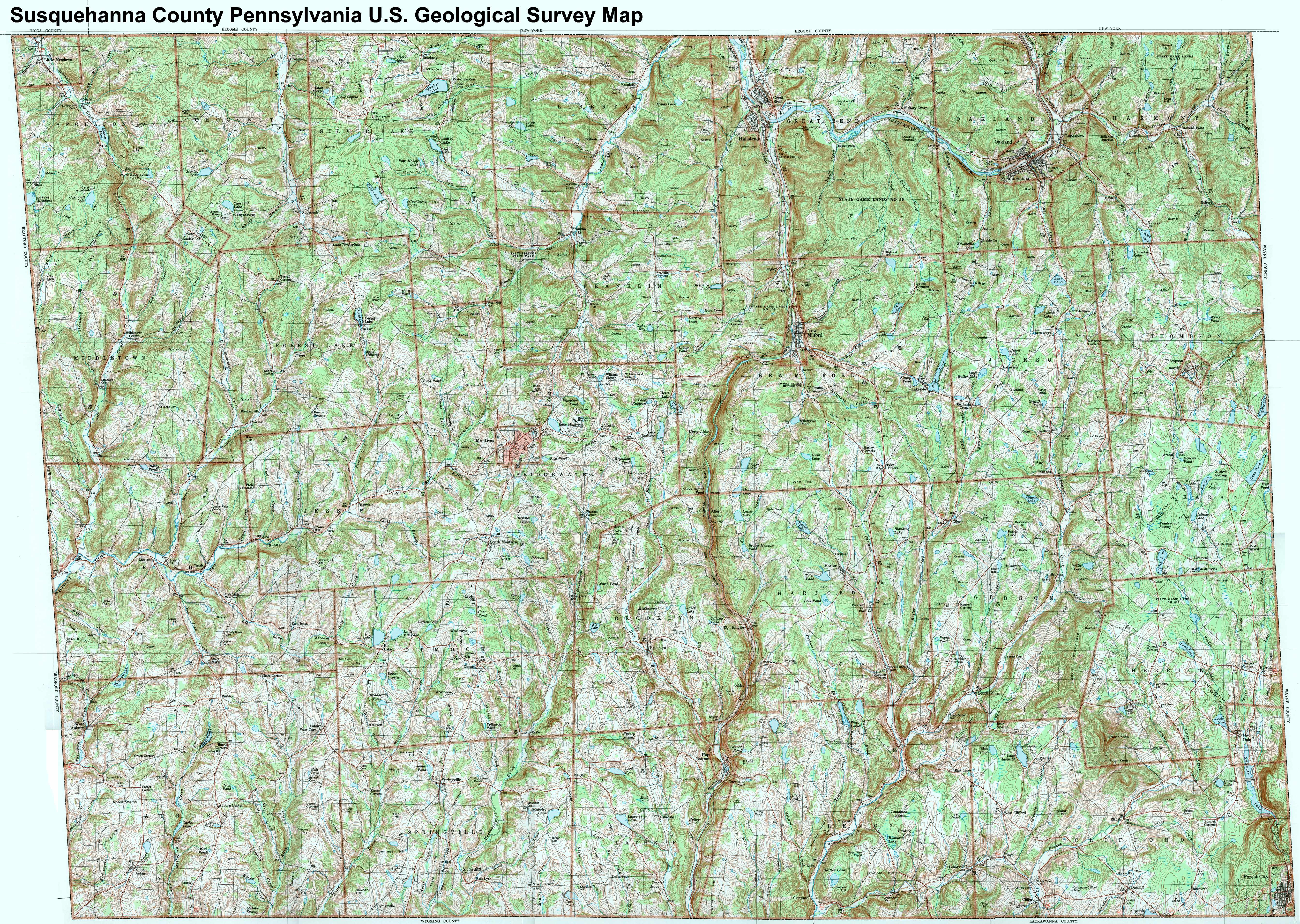 Image Map: This is a clickable image map of townships and boroughs in Susquehanna County Pennsylvania. A text list of the township maps is shown below. The township images are cropped from a 1/50,000 USGS Geological Survey Map of Susquehanna County dated 1987; based on 1/24,000 maps dated 1945 (69PR) through 1968. Adjacent counties shown on the image map have active links to their USGS maps. County Genealogy Sites: There are links to Pennsylvania county USGenWeb sites at the bottom of the Pennsylvania Map Index page. To see the whole county map click here (4.3MB). |