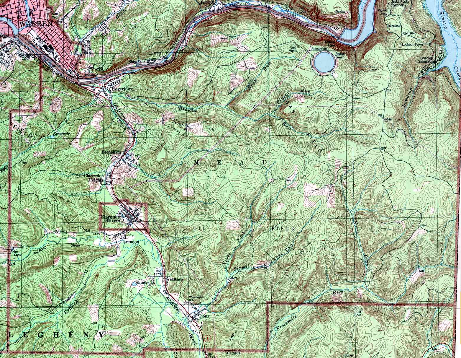 - Mead, Clarendon, Clarendon Heights, Dewdrop Campground, Jacks Rocks, Kinzua Dam, Old Clarendon, Rogertown, Stoneham, Tiona, Weldbank