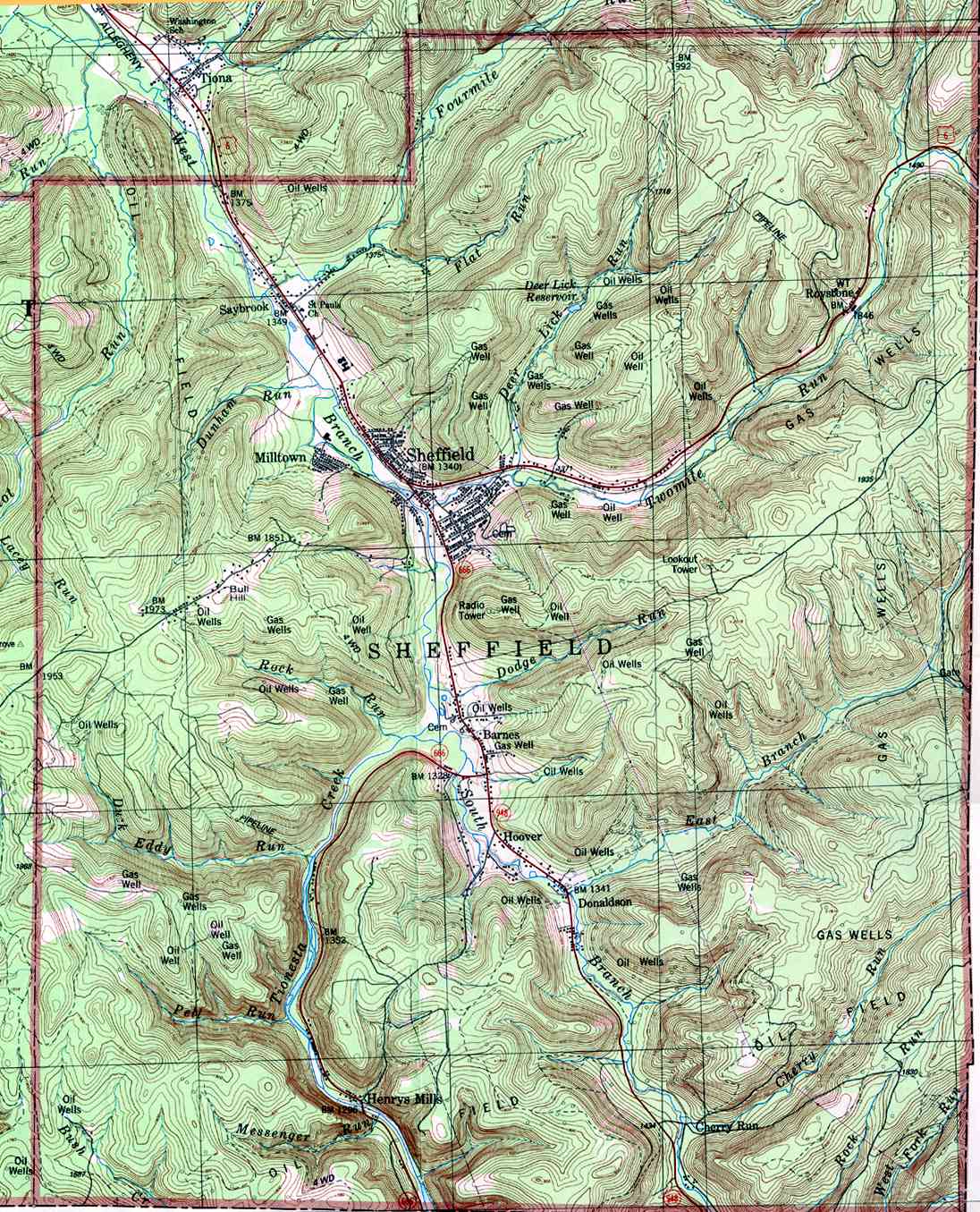 - Sheffield, Barnes, Cherry Run, Donaldson, Henrys Mills, Hoover, Milltown, Roystone, Saybrook, Sheffield