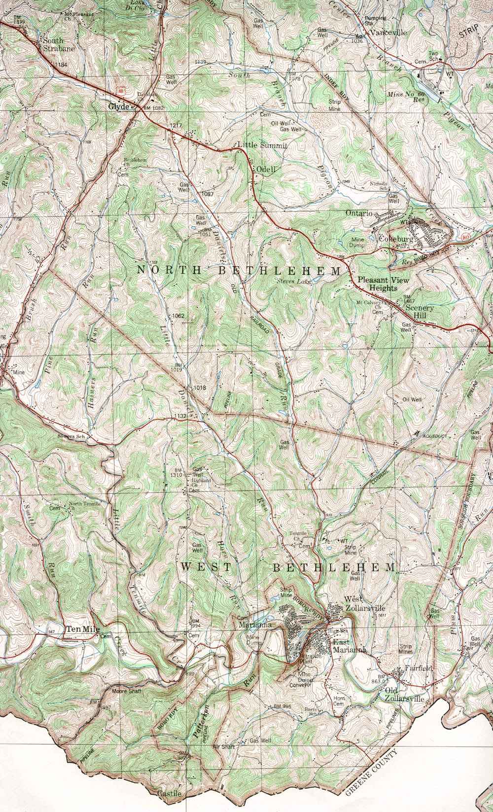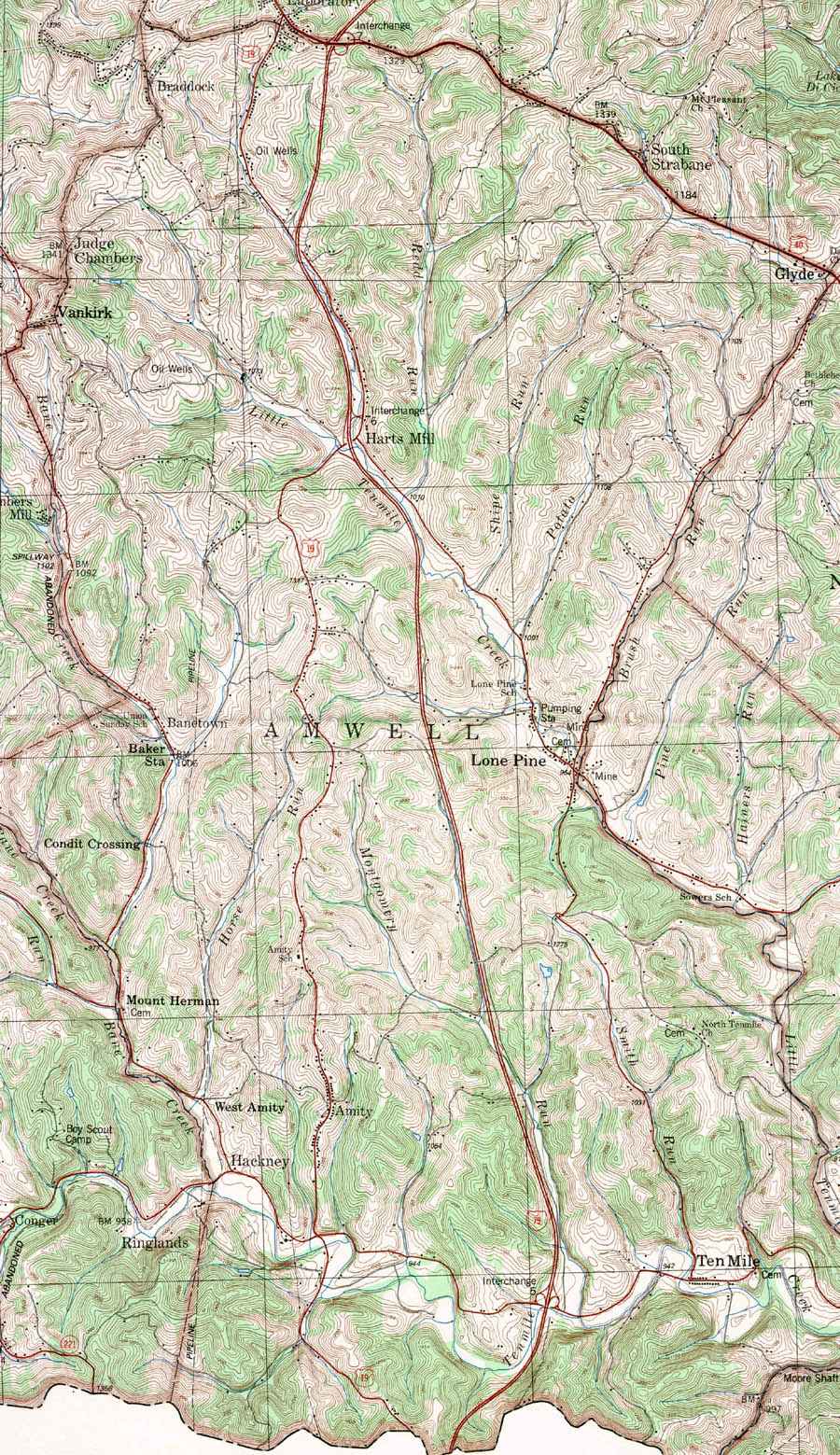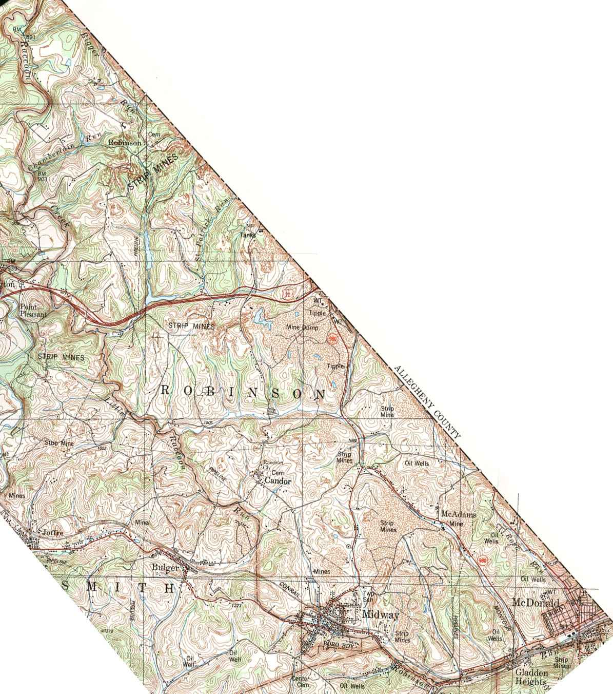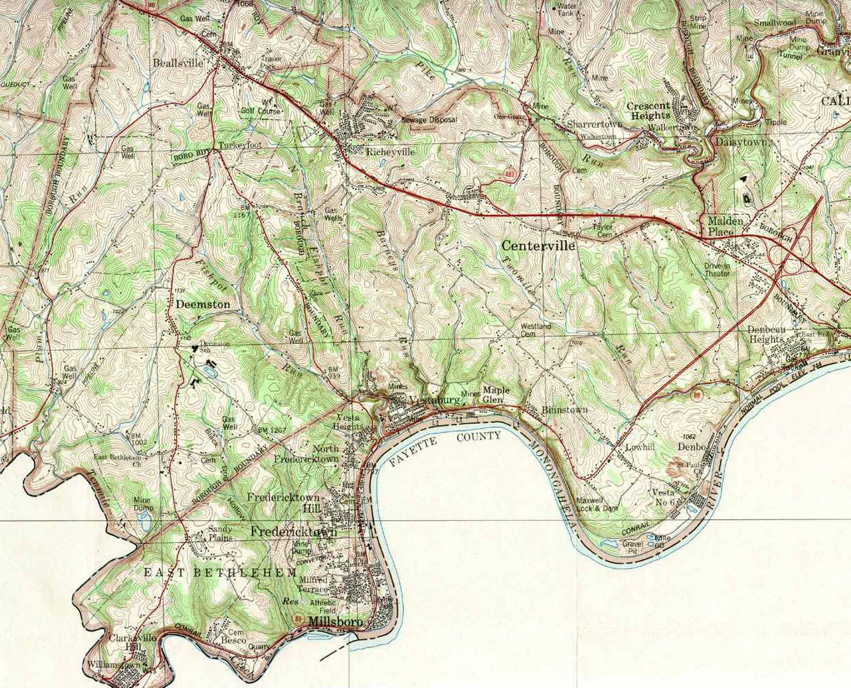 Image Map: Click on the map or on the name of the township or borough shown below. The township maps are cropped from a 1/50,000 US Geological Survey Topographical Map of Washington County dated 1982. The 1/24,000 maps which are the basis of the county map are dated from 1953 to 1964. The adjacent counties shown on the image map are links to their USGS maps. County Genealogy Sites: Link to Pennsylvania county USGenWeb sites at the bottom of the Pennsylvania Map Index page. |