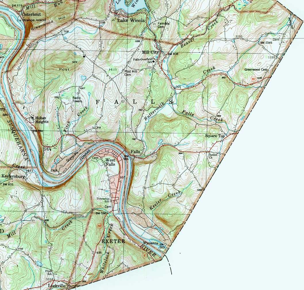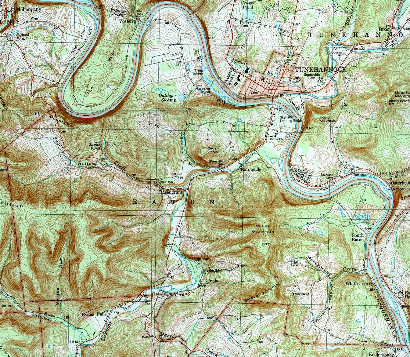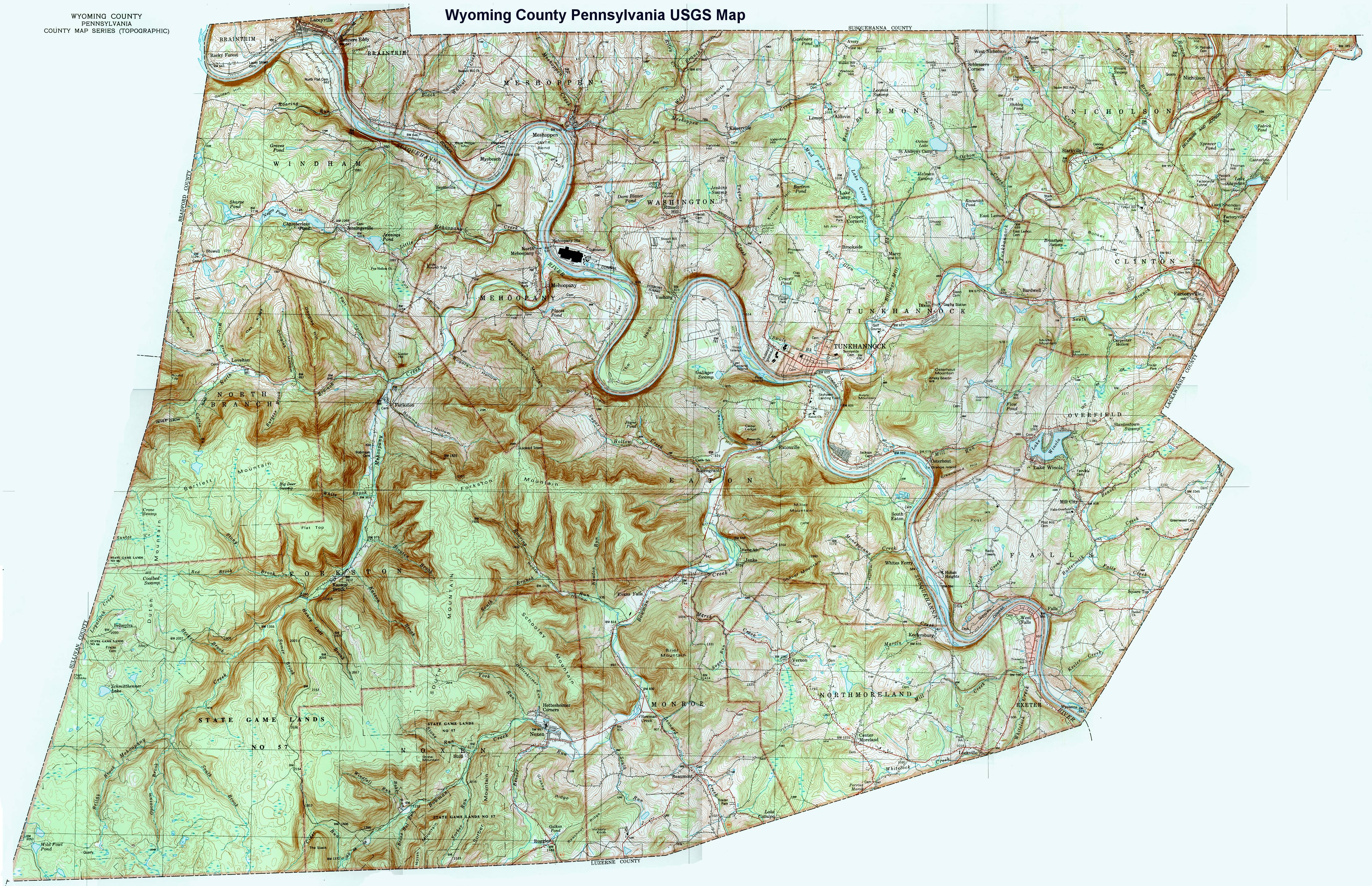 Image Map: This is a clickable image map of townships and boroughs in Wyoming County Pennsylvania. A text list of the township maps is shown below. The township images are cropped from a 1/50,000 USGS Geological Survey Map of Wyoming County dated 1987; based on 1/24,000 maps dated 1945 (69PR) through 1946 (83PR). Adjacent counties shown on the image map have active links to their USGS maps. Note that some townships are combined into one image. |